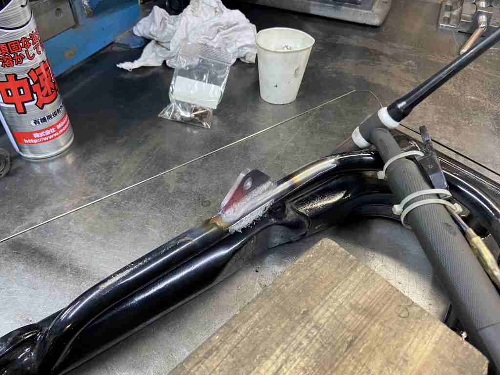 新しいキャリパーサポートに合わせ、トルクロッド受けを溶接します。