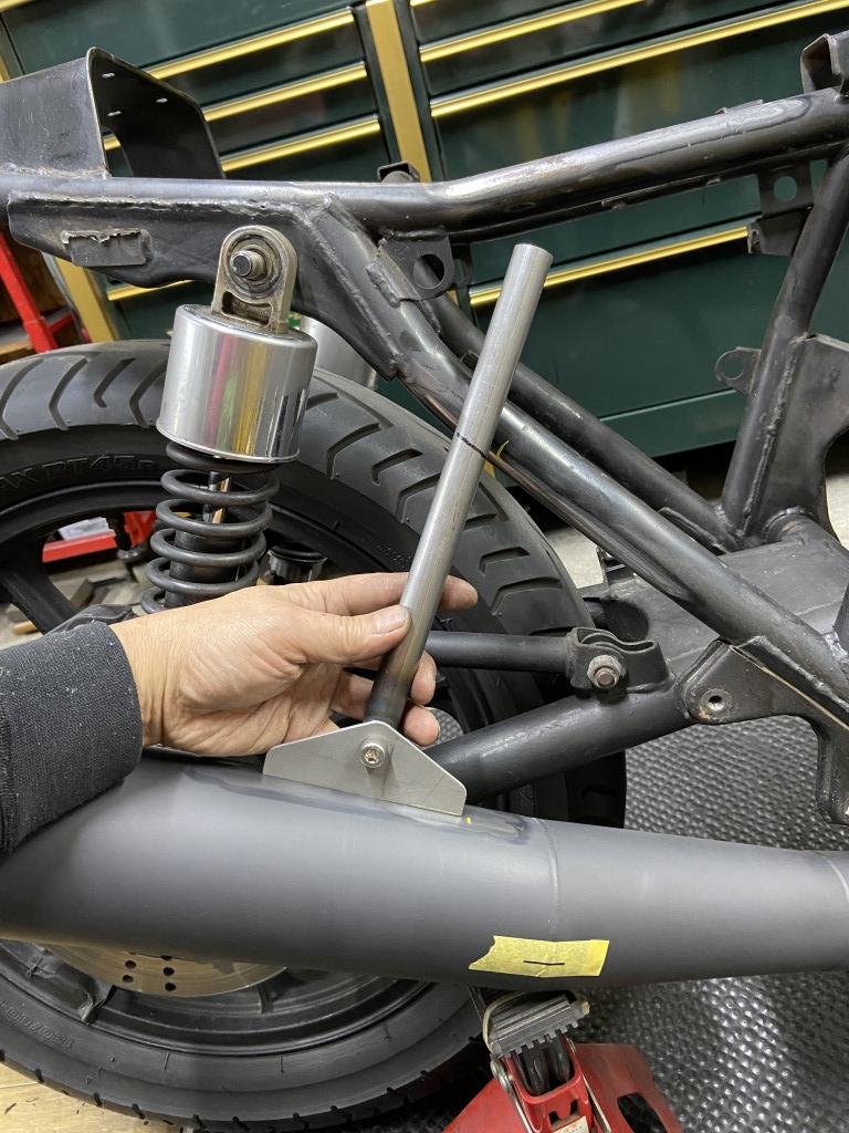 マフラーを所定の角度に固定し、用意したステーを現車合わせで長さを決めます。