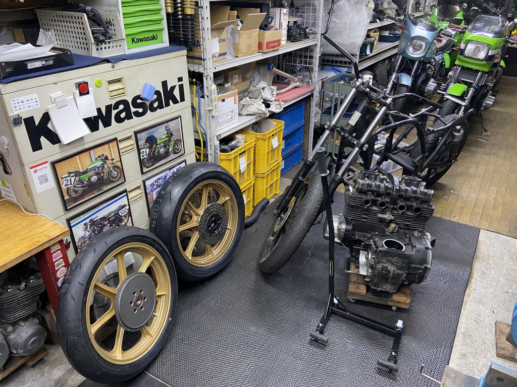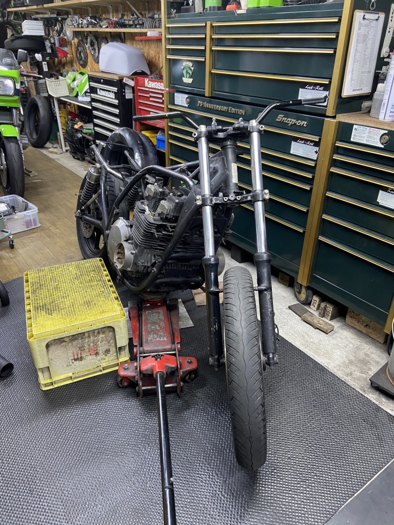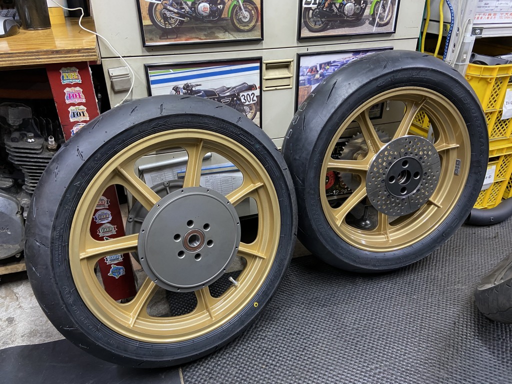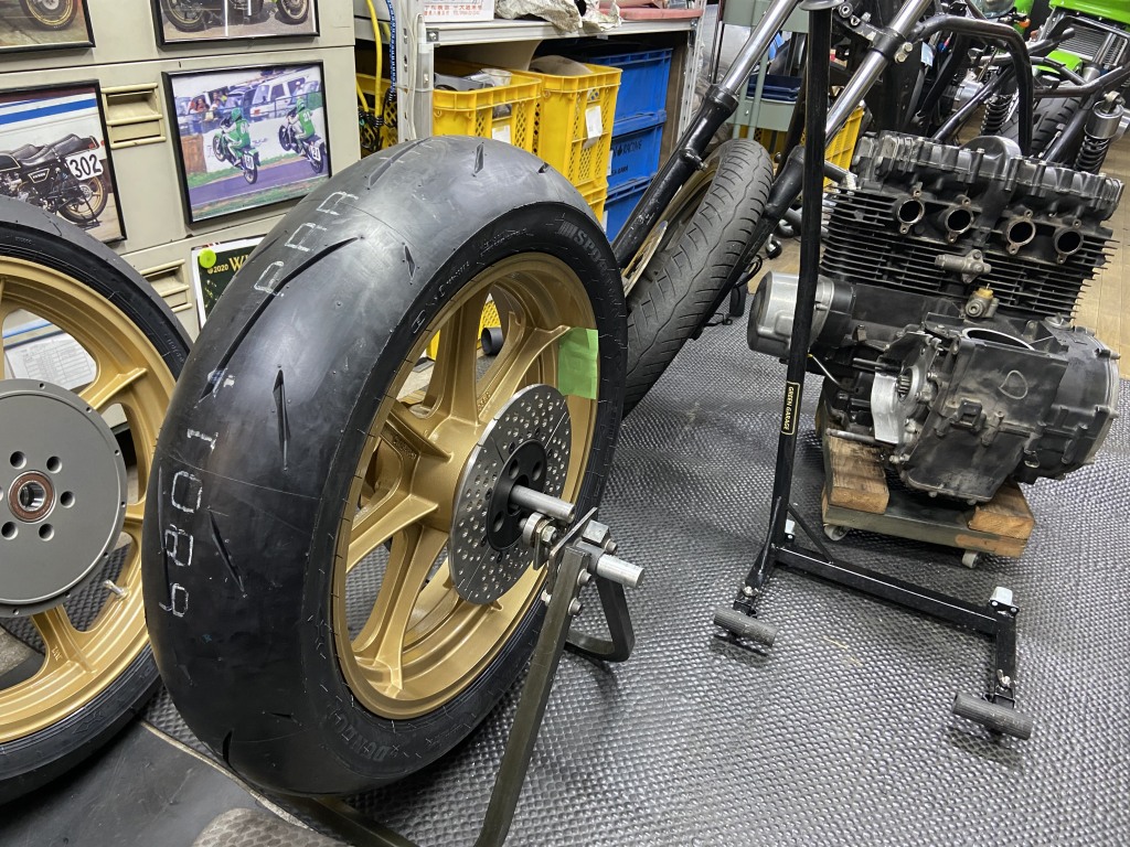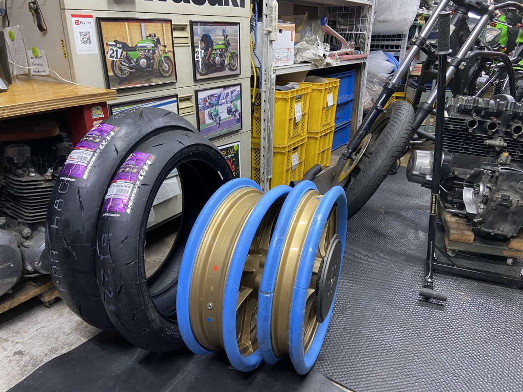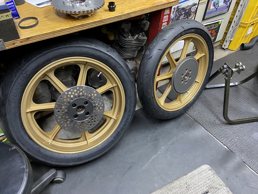 タイヤが入荷したので組付けます。使用するタイヤはダンロップα14Zで、サイズは110/80-18 150/70-18 です。リヤ70扁平がAMAルックの必須アイテムです。