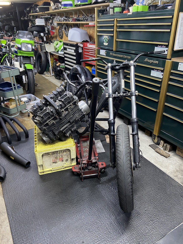 最後はエンジン台車の上に。このあと、フレームはステー溶接などの加工を全て終わらせて、修正、塗装と行うので、組めるようになるのは早くて4月後半ごろになるでしょう。