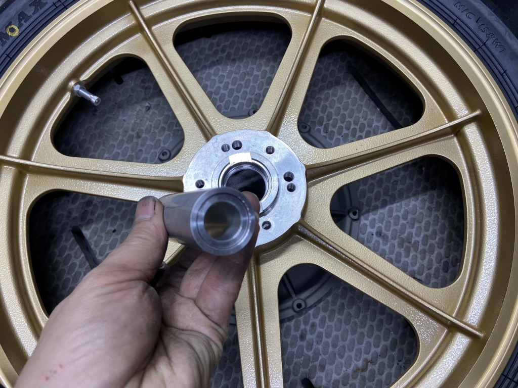 フロントホイール内のディスタンスカラーがこちら。専用シャフトは外径φ18ミリの中空構造。このカラーも専用品です。