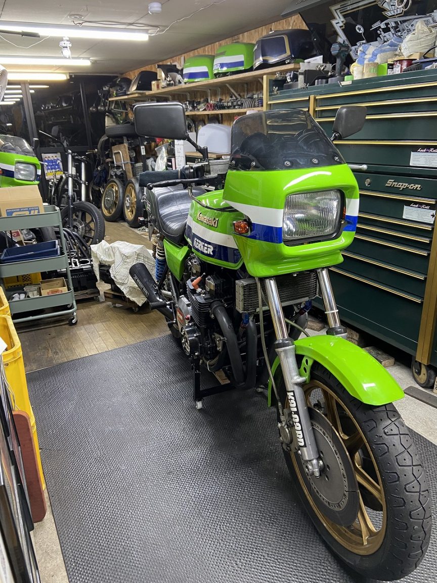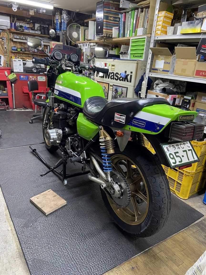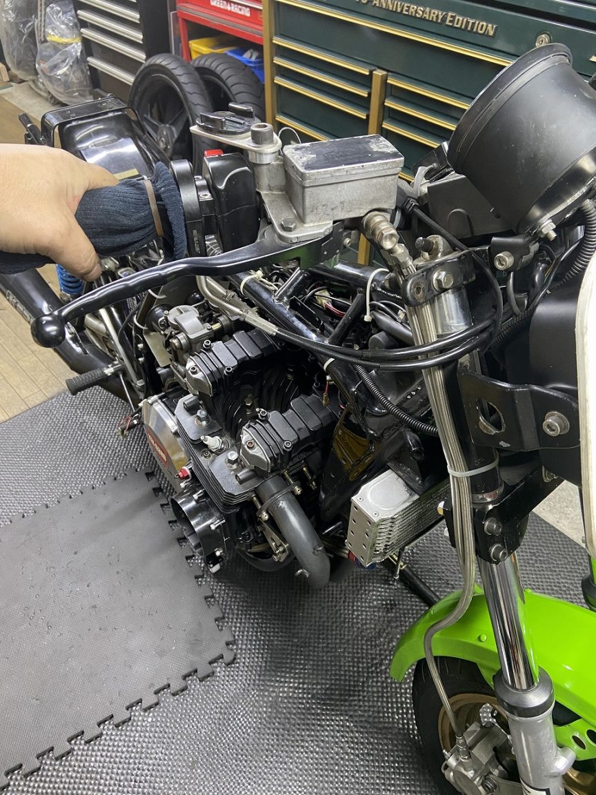 エンジン始動チェックします。マフラーから出るエキゾーストは、ハイコンプピストン特有の力強い排圧を感じます。