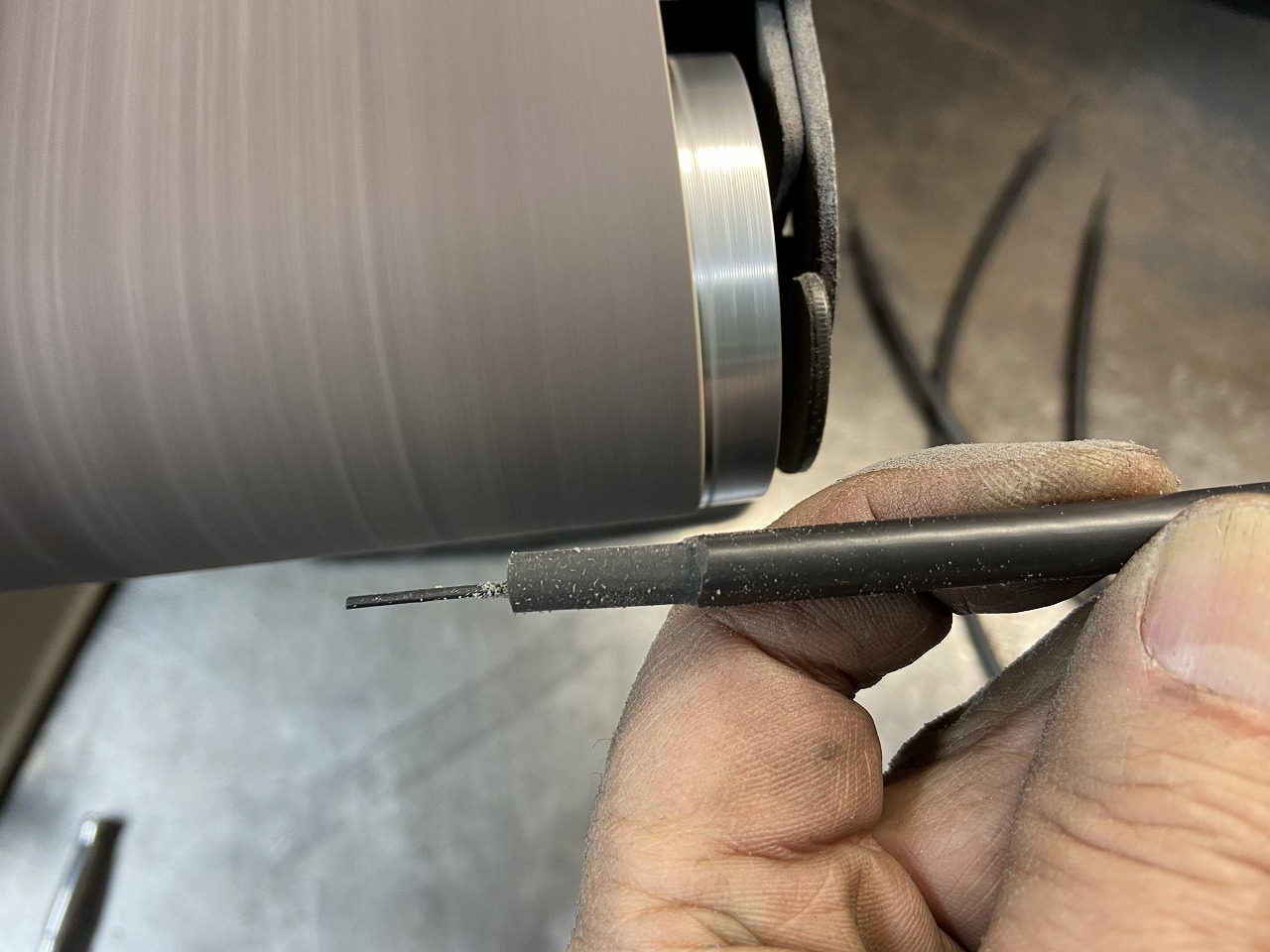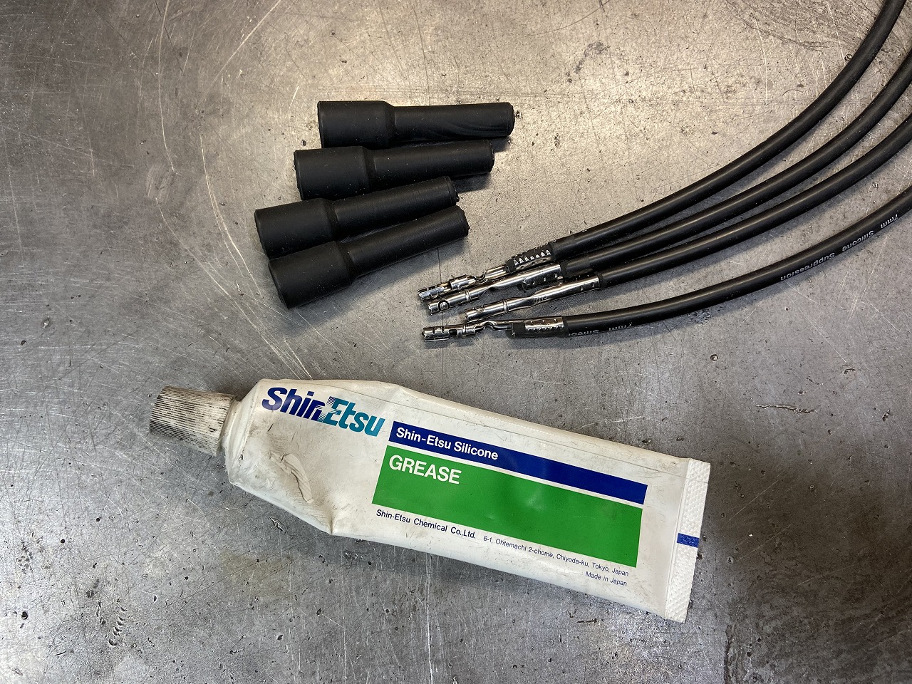 プラグコードも更新します。コイル側ターミナルはφ5ミリようなので、φ7ミリのシリコンコードを細く削ります。