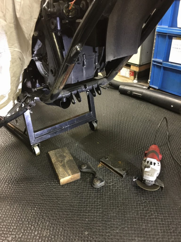 マフラー干渉しないよう、センタースタンドブラケットも削除します。