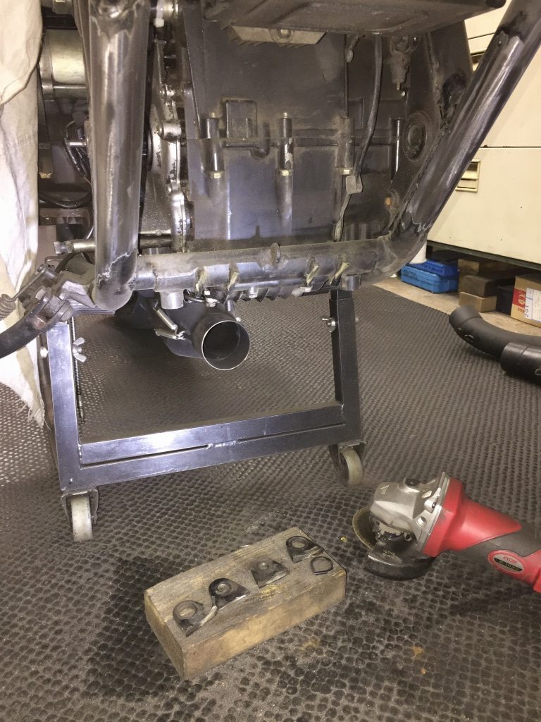 ワークスバックステップ用のボスをフレームに溶接で取り付けます。