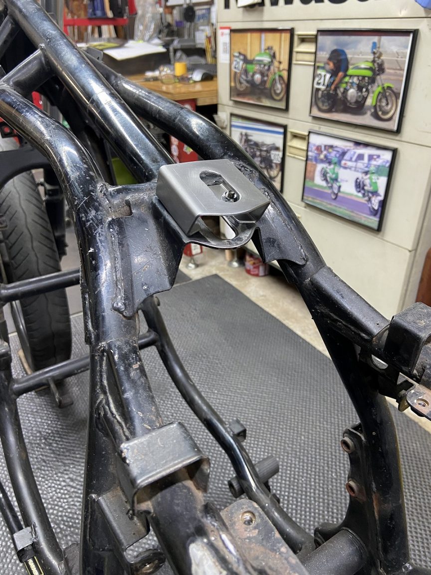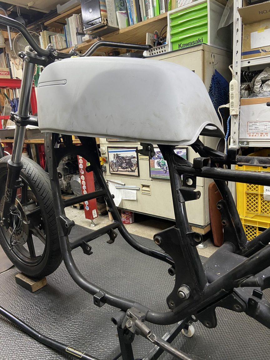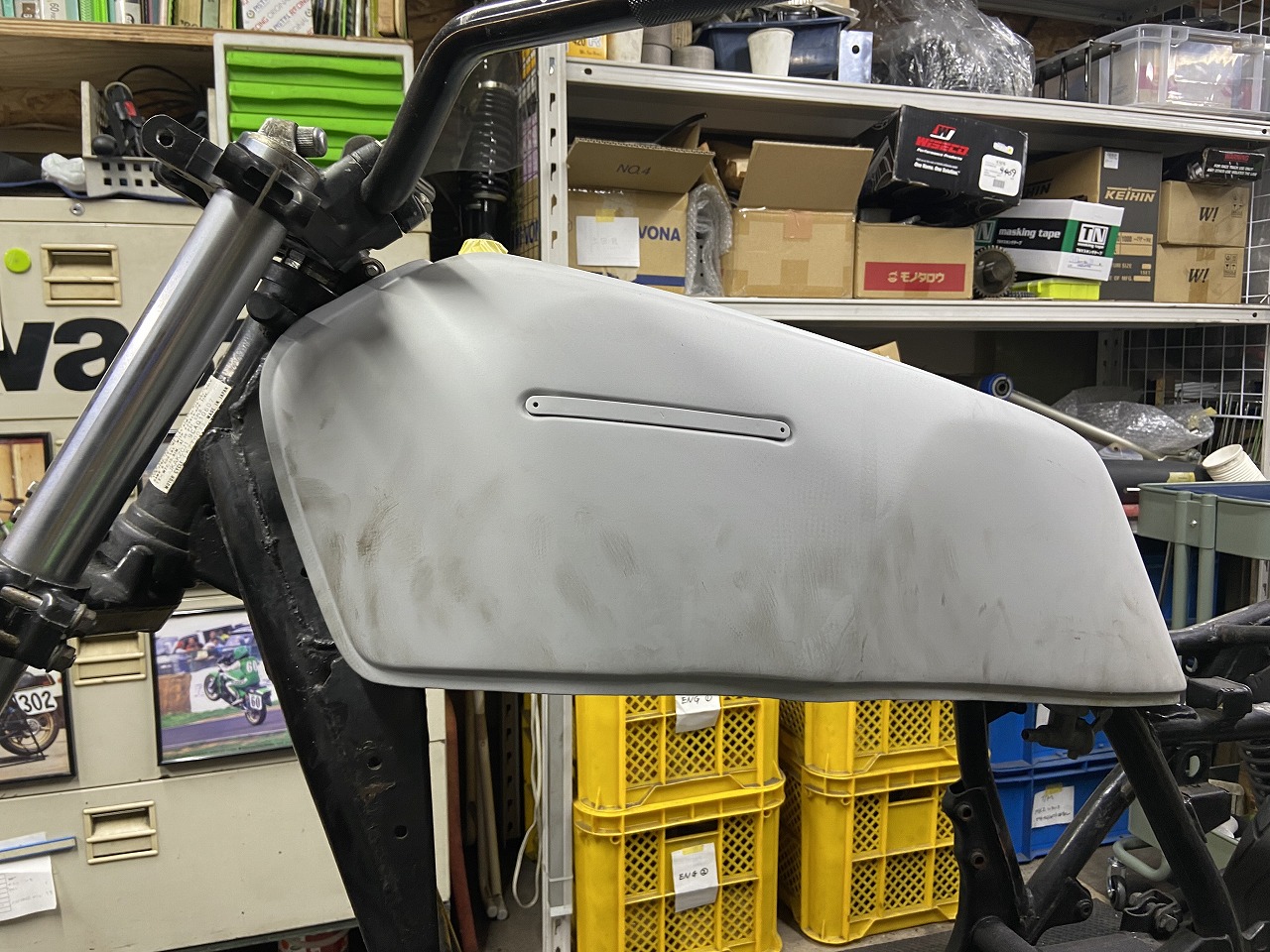 タンクを取付確認します。高いタンク位置がワークス車たるルックスを形作る重要なポイントのひとつです。ノーマル1000RやノーマルS1には無い独特の雰囲気が出るのです。
