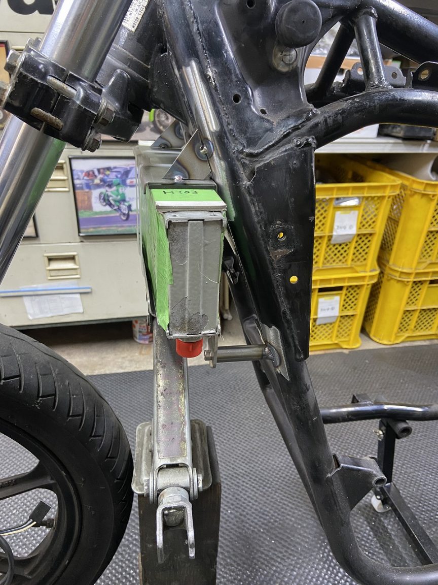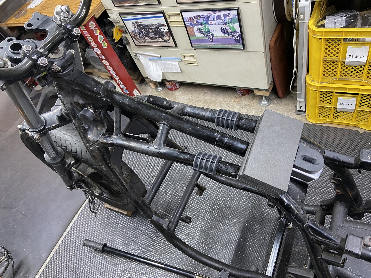 リヤの下駄とスポンジスペーサーを後ろから見るとこんな感じ。タンク後半の重量はスポンジスペーサーで受け持つようにします。ダンパーのところだけ持ち上げていると、突起の根本部分のスポット溶接からクラックが入り、ガソリン漏れすることがあるのでご注意を。