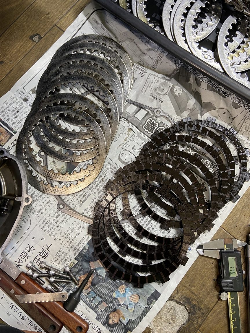 ノーマルエンジンなのでノーマルクラッチで十分対応可能との判断から、クラッチのプレート類一式を新品交換することに。現状のものは2016年の納車時に行ったエンジンオーバーホールでも、消耗が少ないので交換しないで継続使用していたものです。