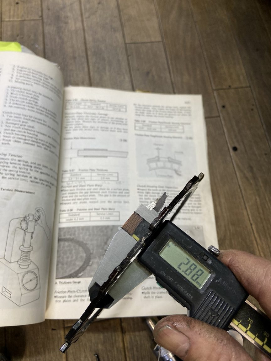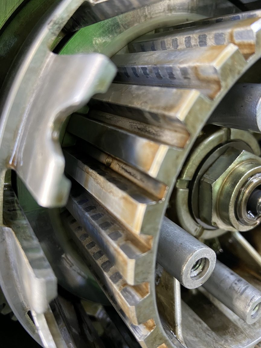 鉄板の方のクラッチプレートは、特に焼けもなく全体的に当たりがついている状態。こちらのフリクションプレートに関しては、マニュアルの新品下限値より0.1ミリほど摩耗している状態で、まだ限度値までは摩耗していません。