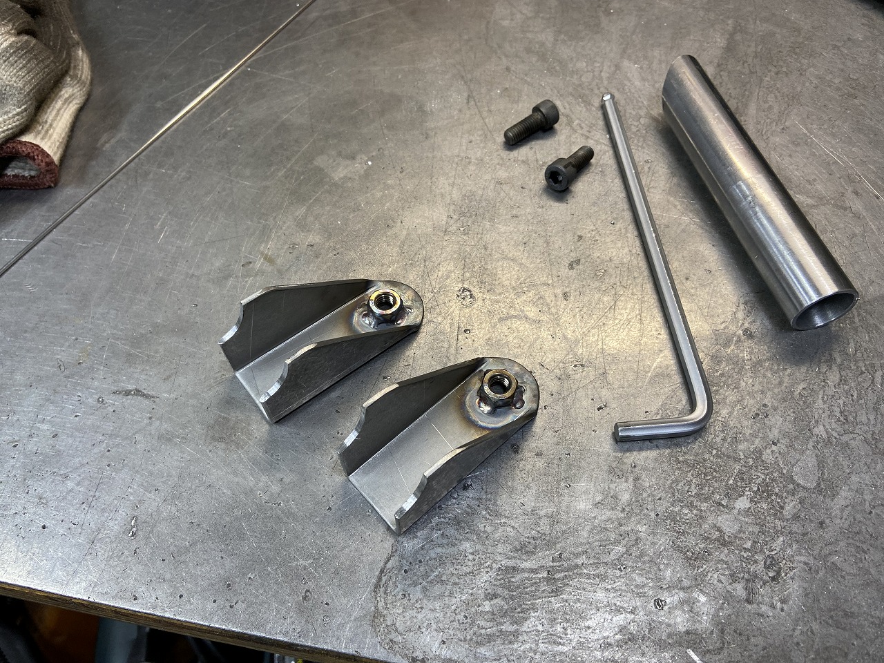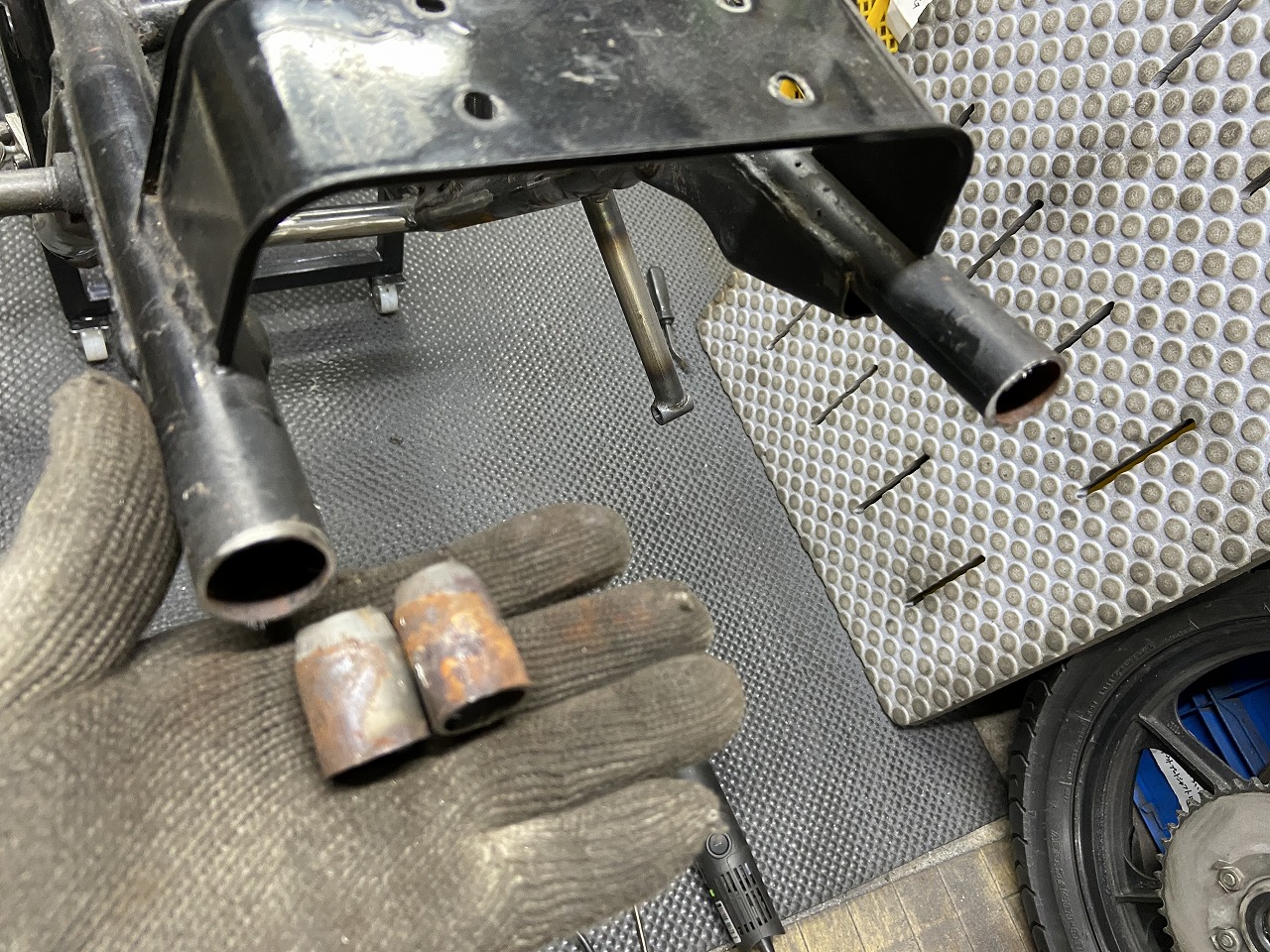 続いてワークスバックステップのボスを溶接します。バックステッププレートを治具にして仮溶接します。