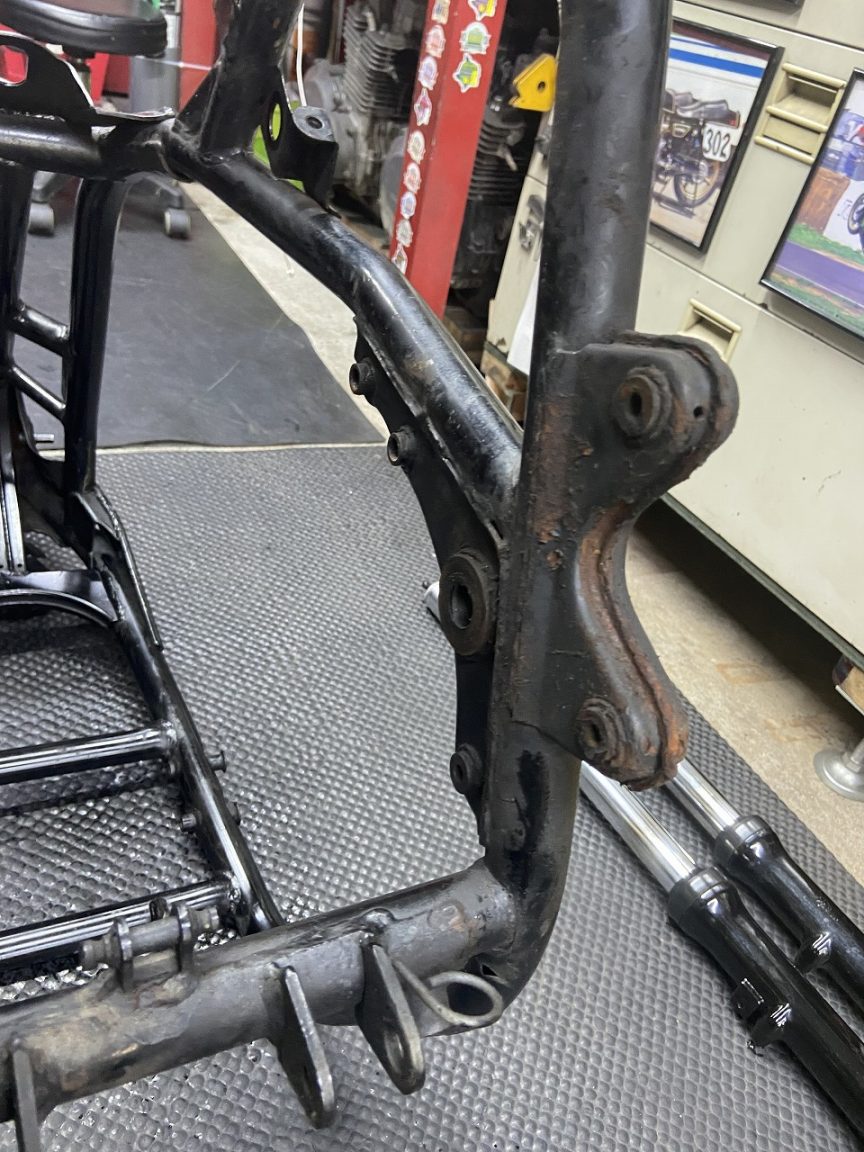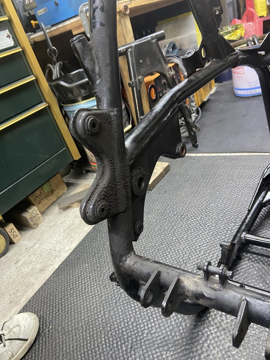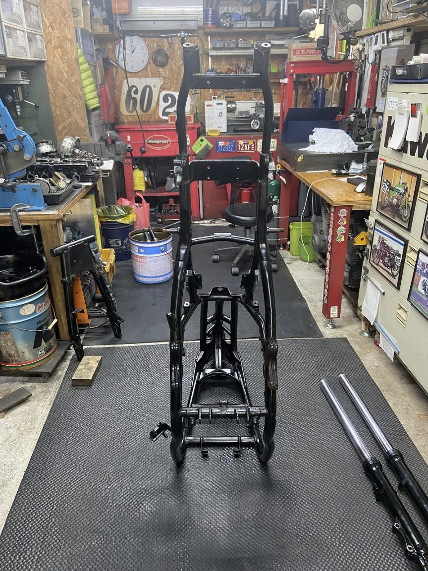 今回はフレーム加工前に修正を施工していただきます。ちなみに左側のフレームは、先日依頼してあった1000Jのフレームで、修正が終わったので引き取ります。