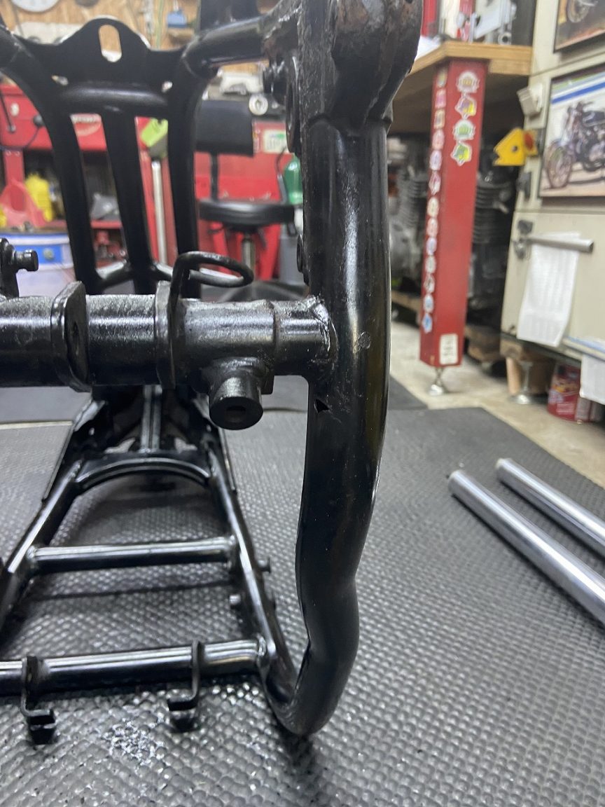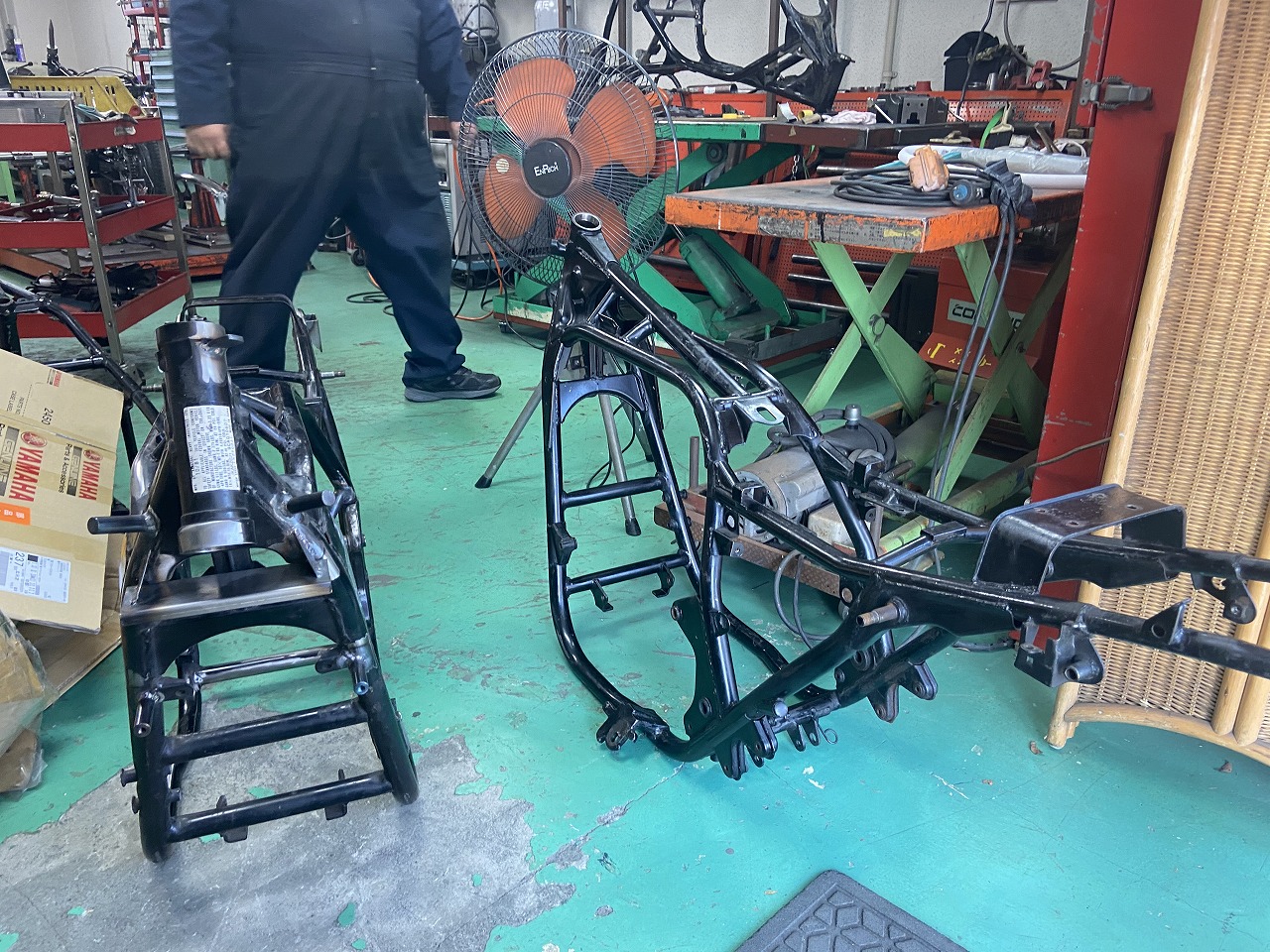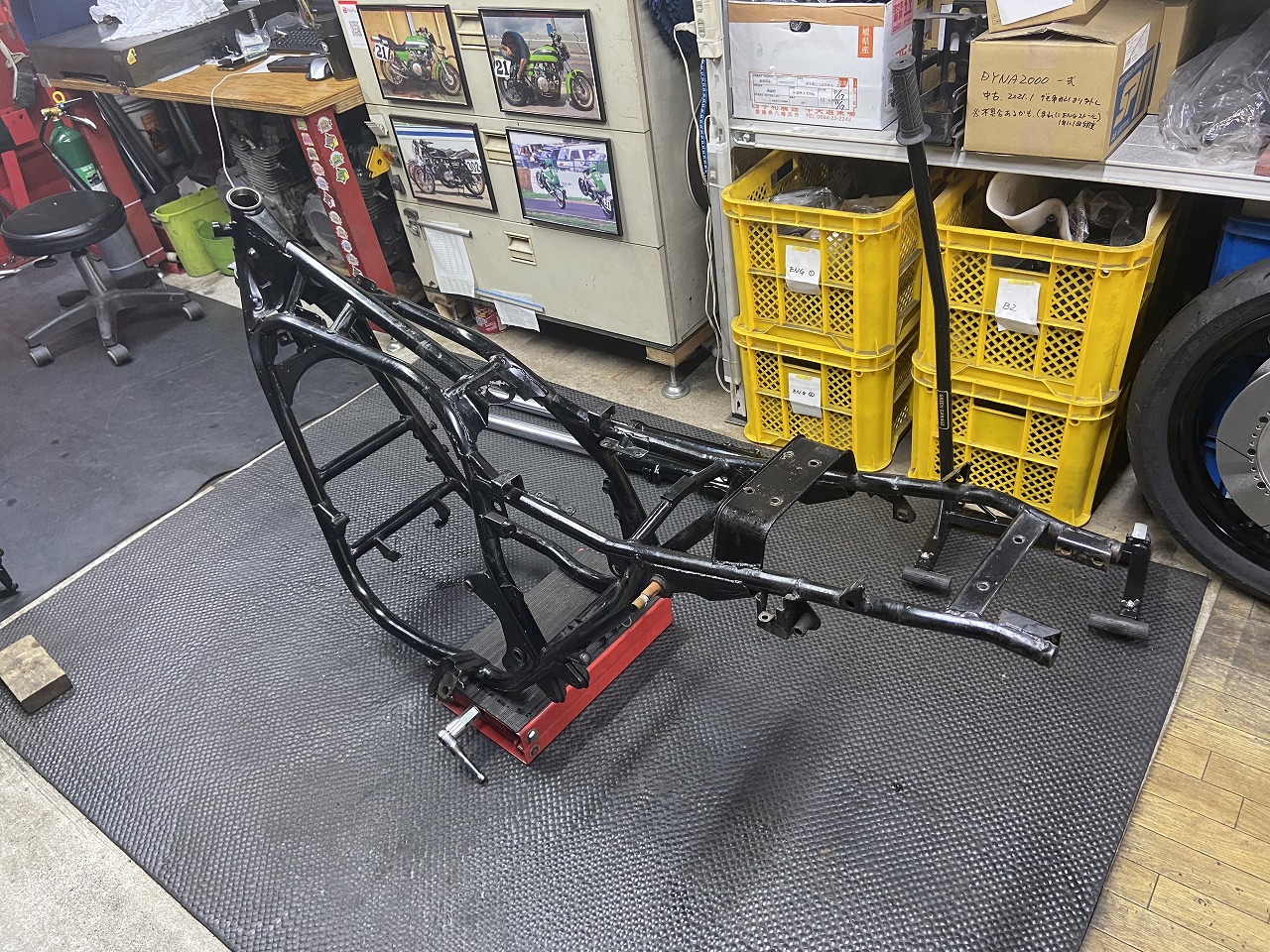 今回はフレーム加工前に修正を施工していただきます。ちなみに左側のフレームは、先日依頼してあった1000Jのフレームで、修正が終わったので引き取ります。