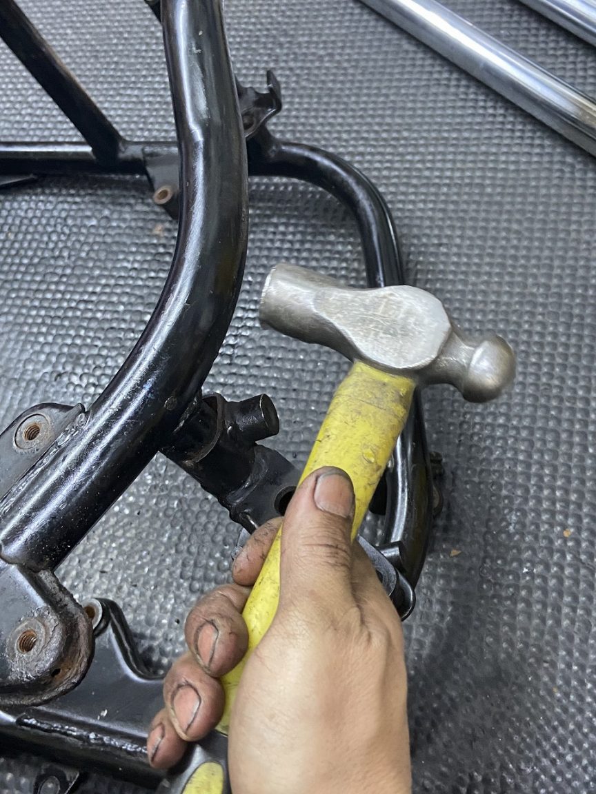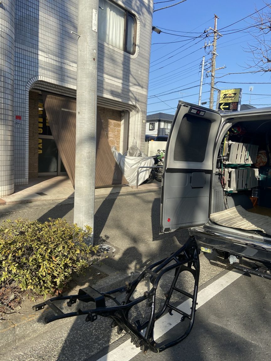 フレームはそのまま修正工場に持ち込みます。こちらは老舗のモトショップ梶ヶ谷さんです。