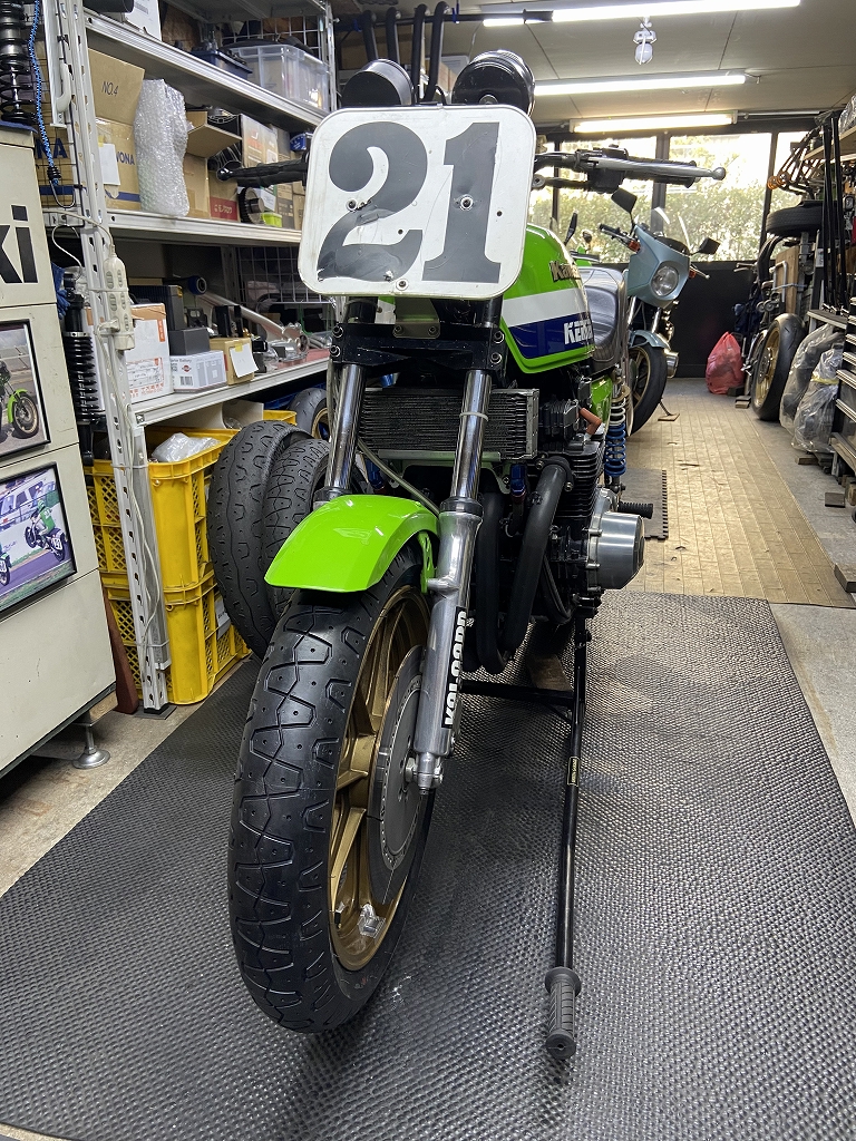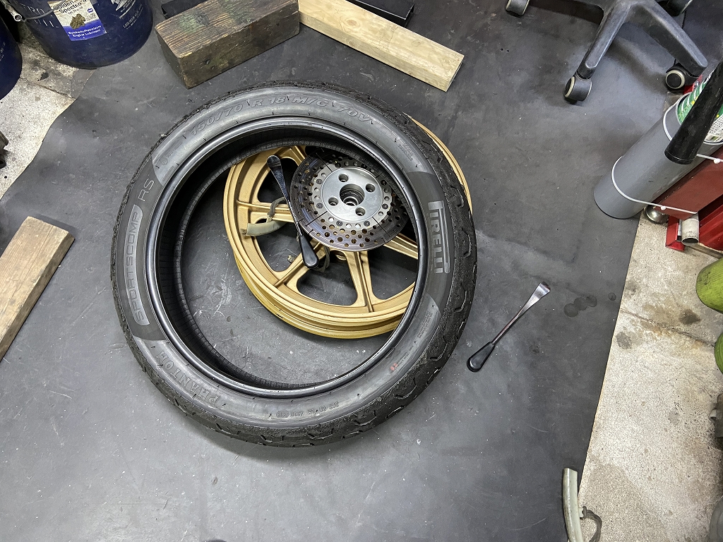 正式な銘柄は、PIRELLI PHANTOM SPORTSCONP RS(ピレリ ファントム スポーツコンプ アールエス)で、サイズはフロント110/80-18 リヤ150/70-18 です。リヤ70扁平は、現状ではダンロップα14とこのピレリだけです。
