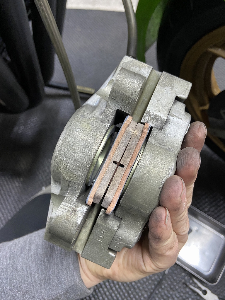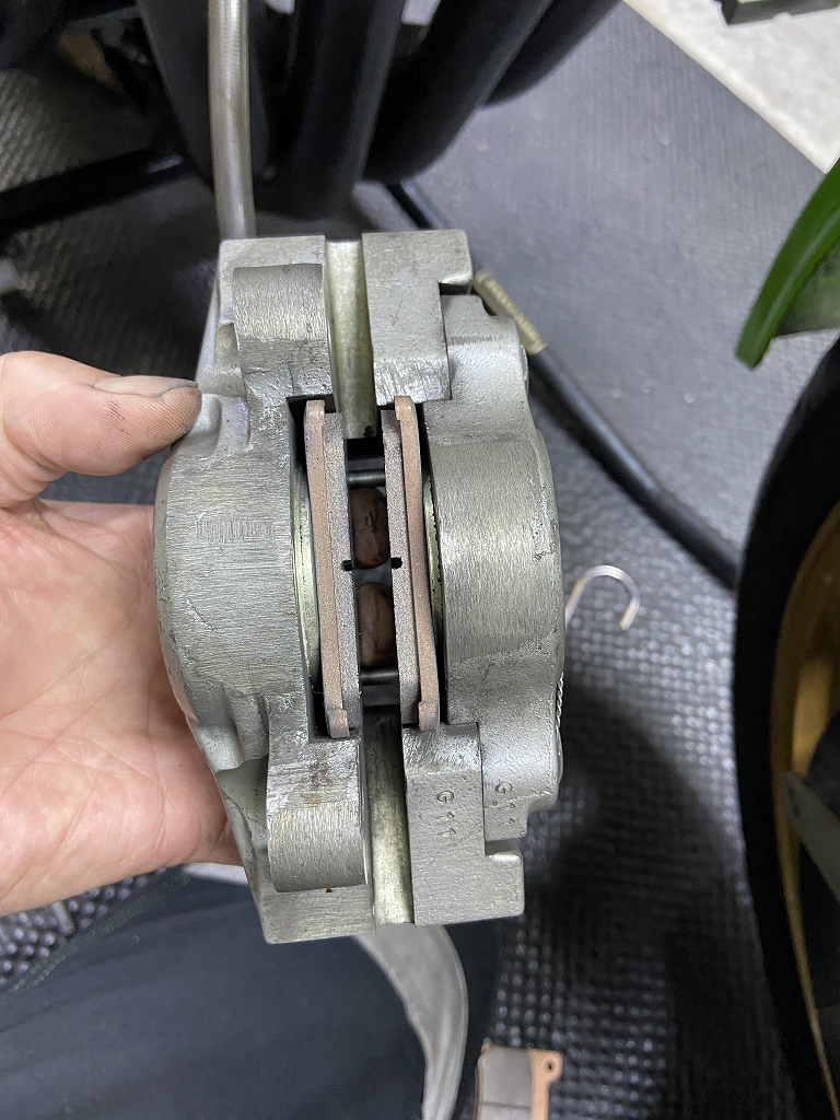 フロントのブレーキパッドも消耗してきたので交換します。S1キャリパーはピストン径が大きく厚みが薄いのでピストンが傾きやすく、ピストンの出代が大きくなるとタッチが悪くなってきます。そこで2ミリくらい減ったら新品交換しています。