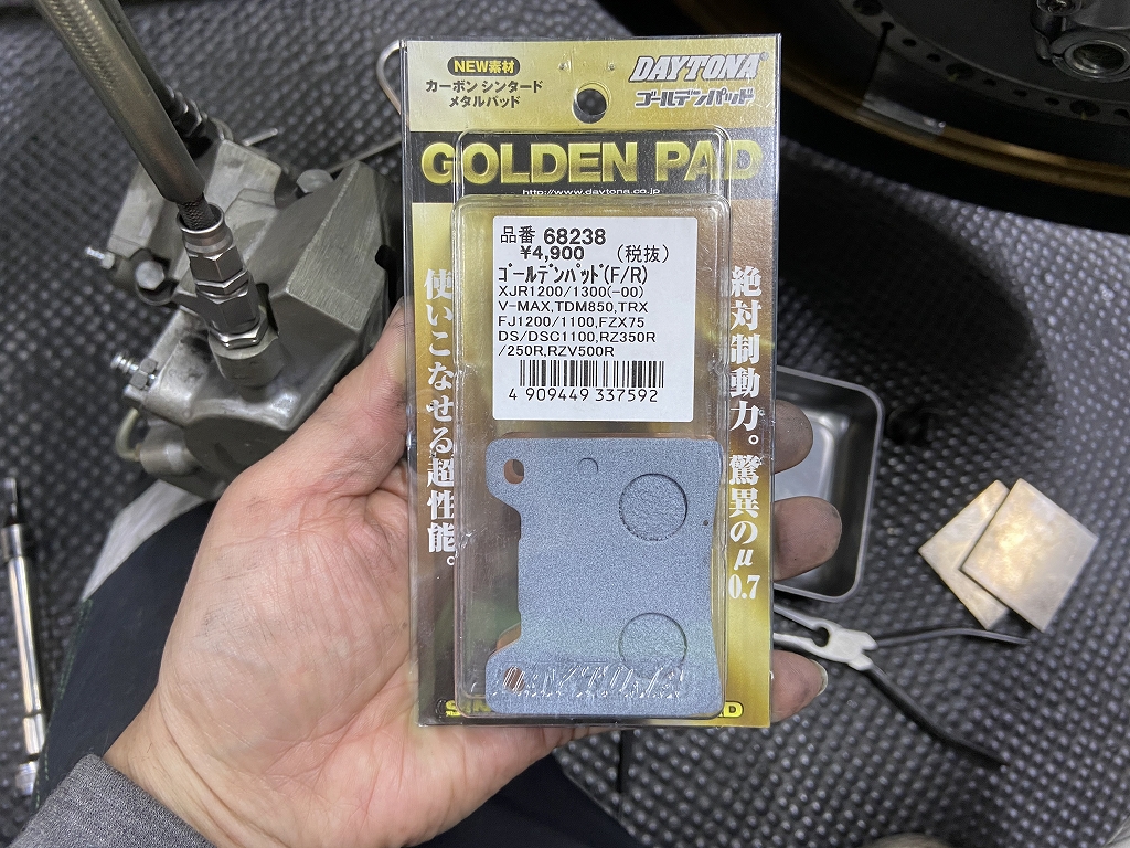使用するパッドはこちら。デイトナゴールデンのV-MAXなど用です。ワインディングでも筑波サーキットでも問題なく使えます。雨でも大丈夫です。