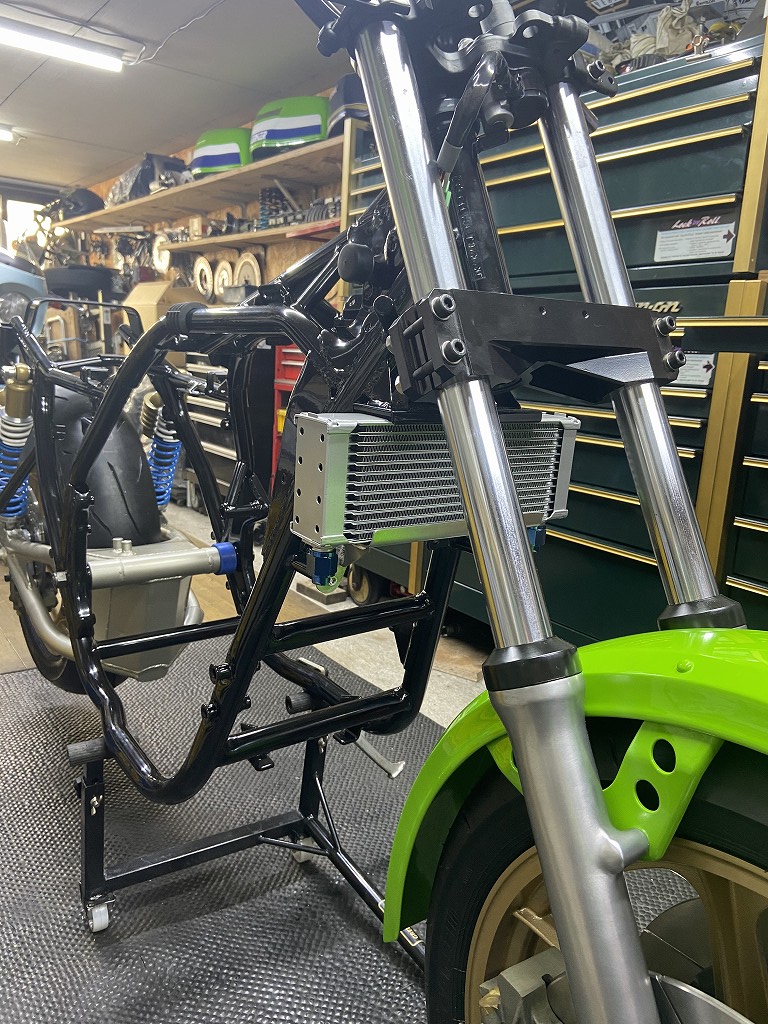 ワークスはこの垂直マウントが特徴です。フォークがボトムした時にフロントフェンダーとの干渉を避けるため、コアは高い位置に取り付けられたいます。