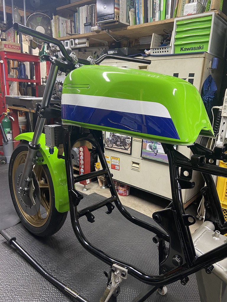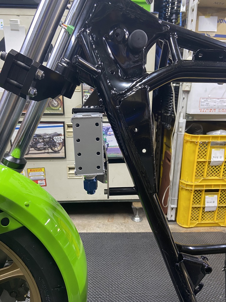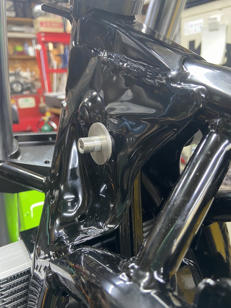 タンクマウントもややアップするのがワークス車の特徴です。フロントはマウントピンの位置を2センチ上に移設しています。