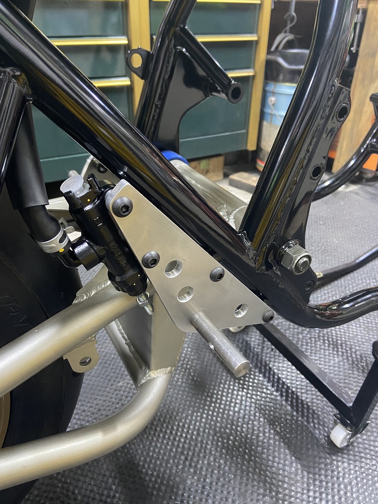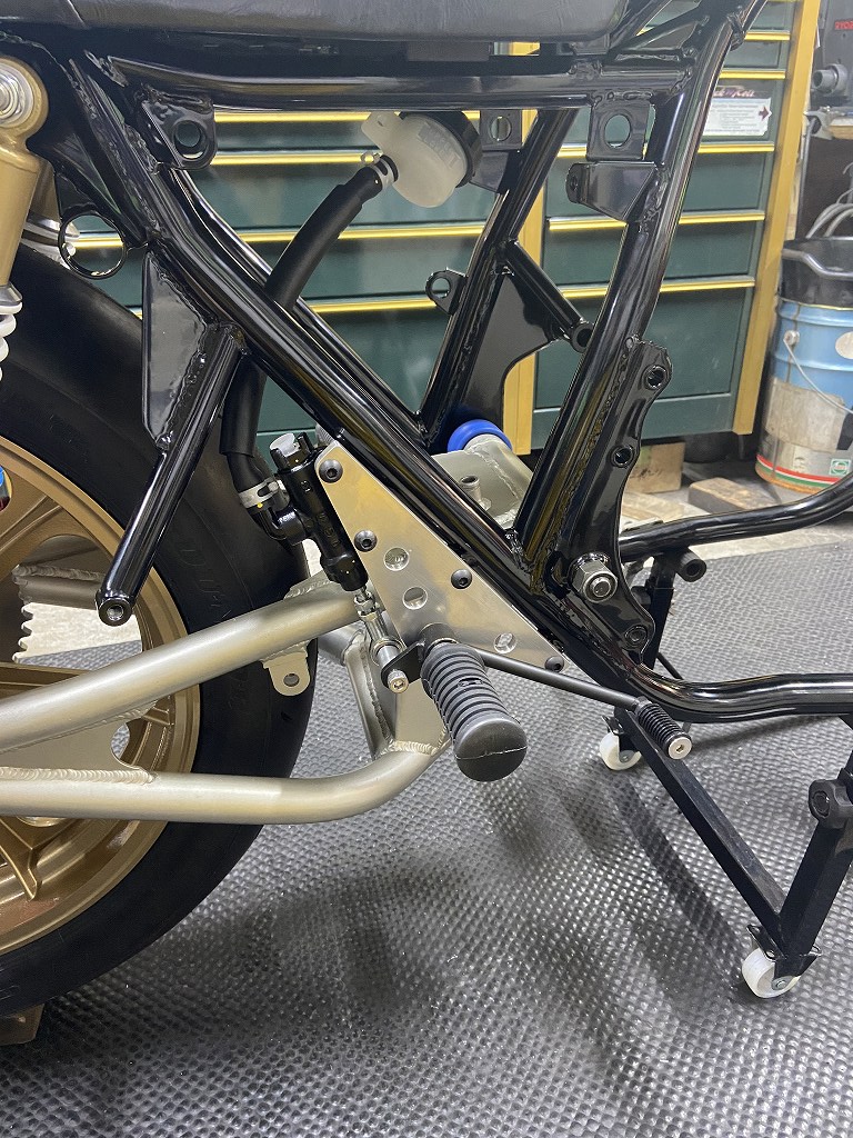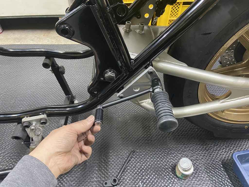 続いてワークスステップを取り付けます。フレームに溶接したボスはS1と同じですが、ステッププレートやペダル類はワークス車専用のデザインを踏襲。