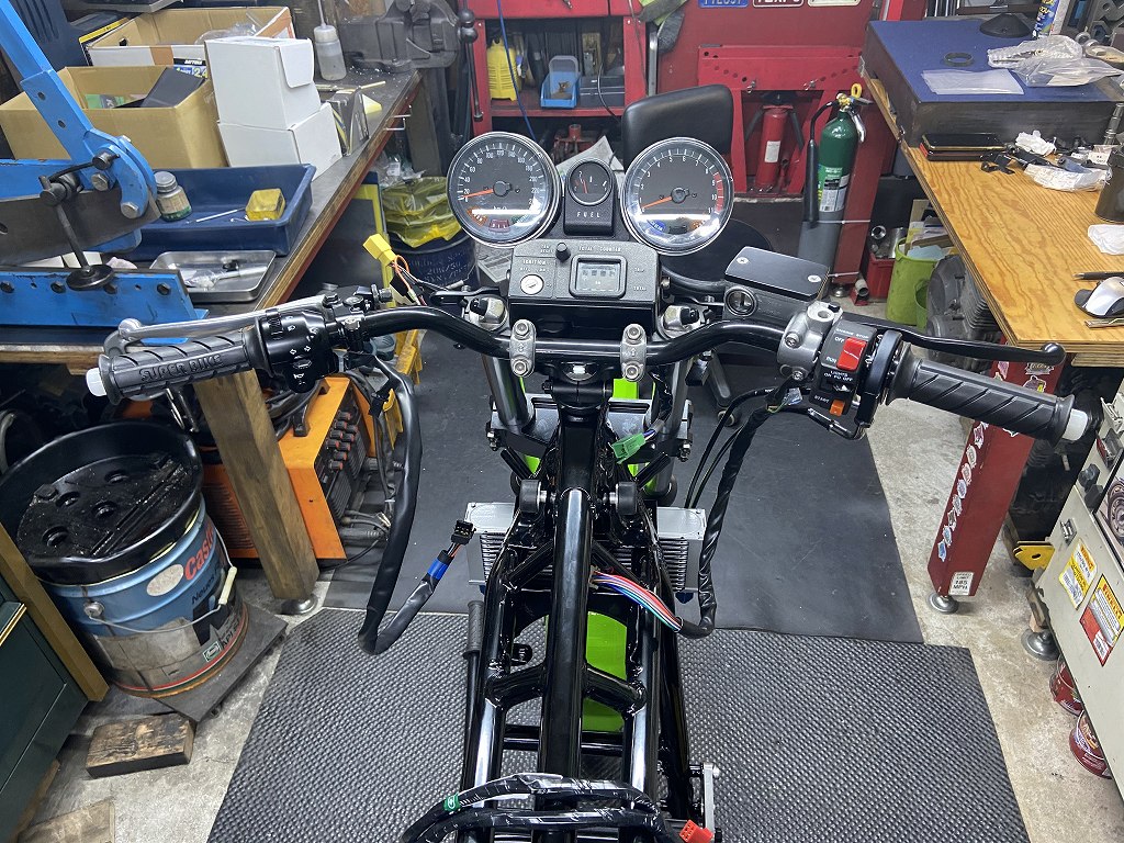 続いてハンドル周り。フロントマスターはZ1000R純正を使います。クラッチレバーはZ1300純正、ホルダーはZ1000J純正、何れも現在でも購入可能な純正部品です。左のハンドルスイッチはW650前期の純正、ウインカーがプッシュキャンセルなので便利です。スイッチのタッチと耐久性は、やはり純正品がいいようです。