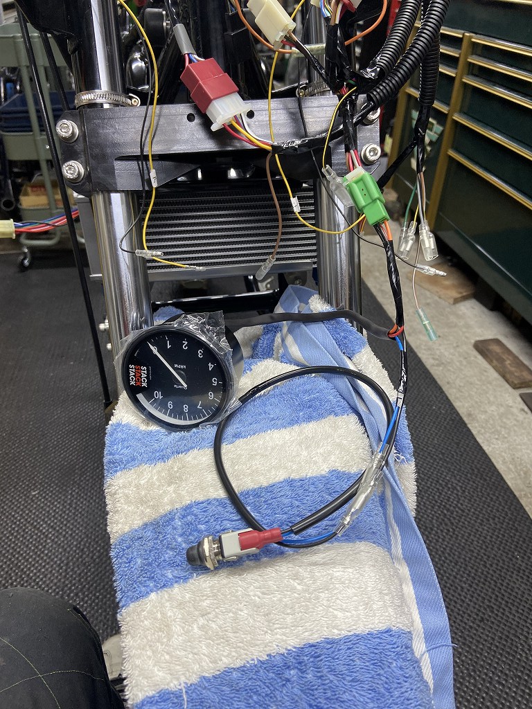 製作したタコメーターハーネスはこちら。ノーマルタコメーターと同じカプラーに付くように合わせあてあります。付属のスイッチは、初期設定とピーク回転数呼び出しをするためのものです。