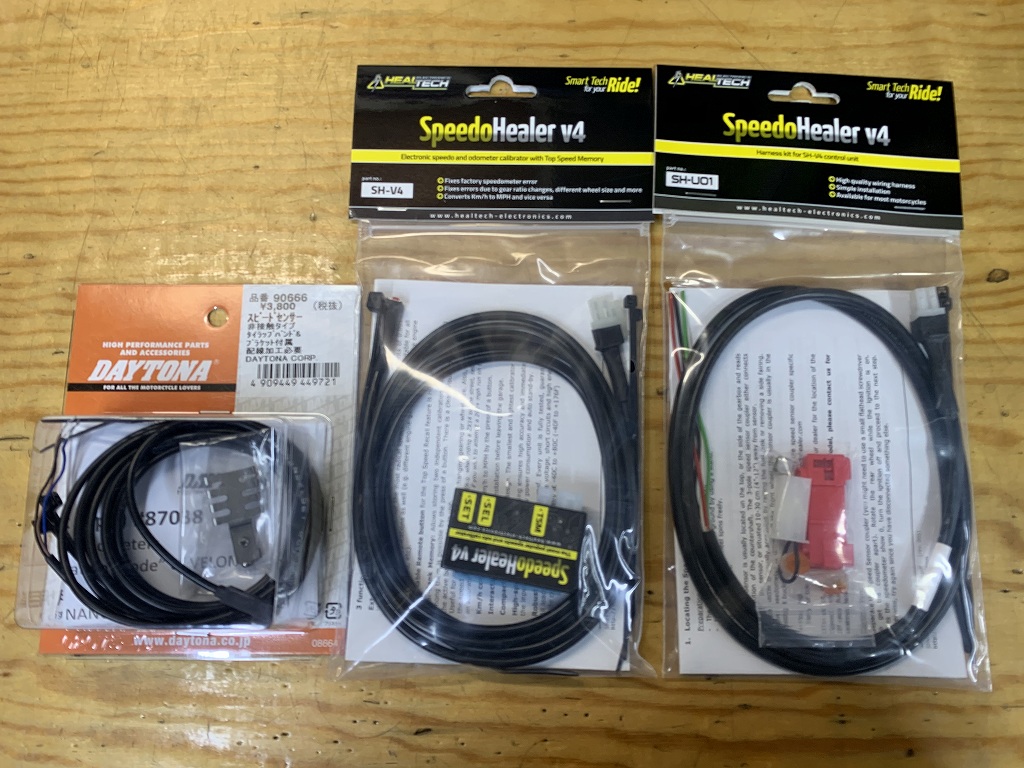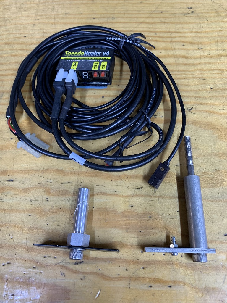 続いてスピードメーターハーネスを製作します。スピードメーター本体はノーマルを使用し、回転の取り出しはフロントS1ローターからではなく、ミッションのアウトプットシャフトから取り出します。センサー系は市販のこちら2点を組み合わせて製作します。左がデイトナ製の汎用非接触スピードセンサーです。右が周波数変換装置のスピードヒーラーで、ギヤ比やリヤタイヤ直径にまつわるメーター誤差を任意の係数をセットすることで正しい表示に修正できます。
