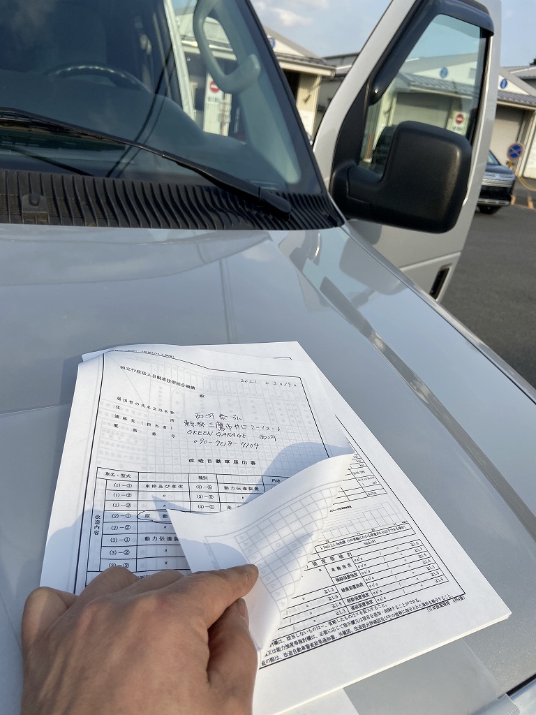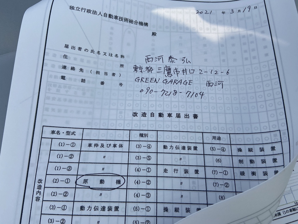 「標準車」が元のノーマル状態、エンジン型式が変わるので今度は「改造車」となります。後日、ナンバー管轄の陸事に今回の合格通知書と車両を持って行き、「構造変更検査」を受ければ晴れて公認車両となります。