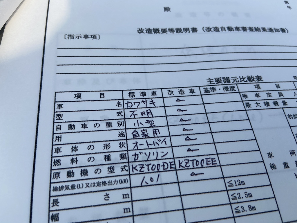 Z1R-2型にZ1000-STのクランクケースを使うので、エンジン型式変更のための申請書類を作成しました。書類の名目は「改造自動車届出書」というものです。