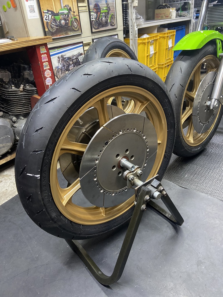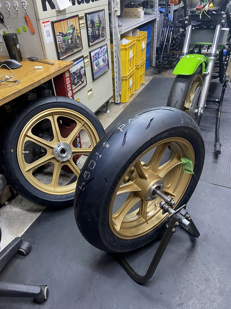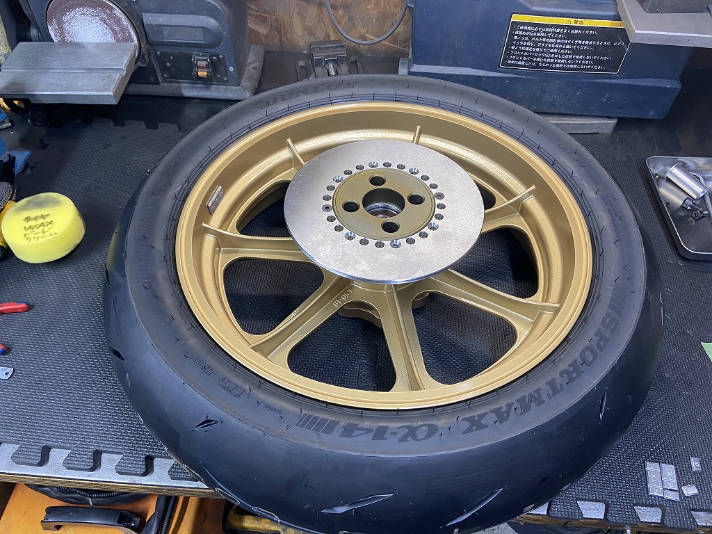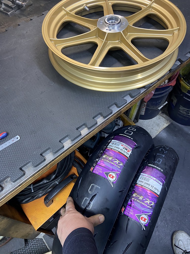 組み込むタイヤはダンロップα14Zです。サイズは110/80-18 150/70-18です。