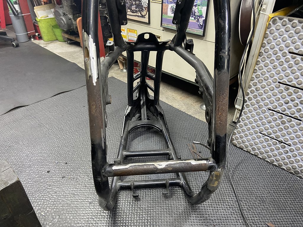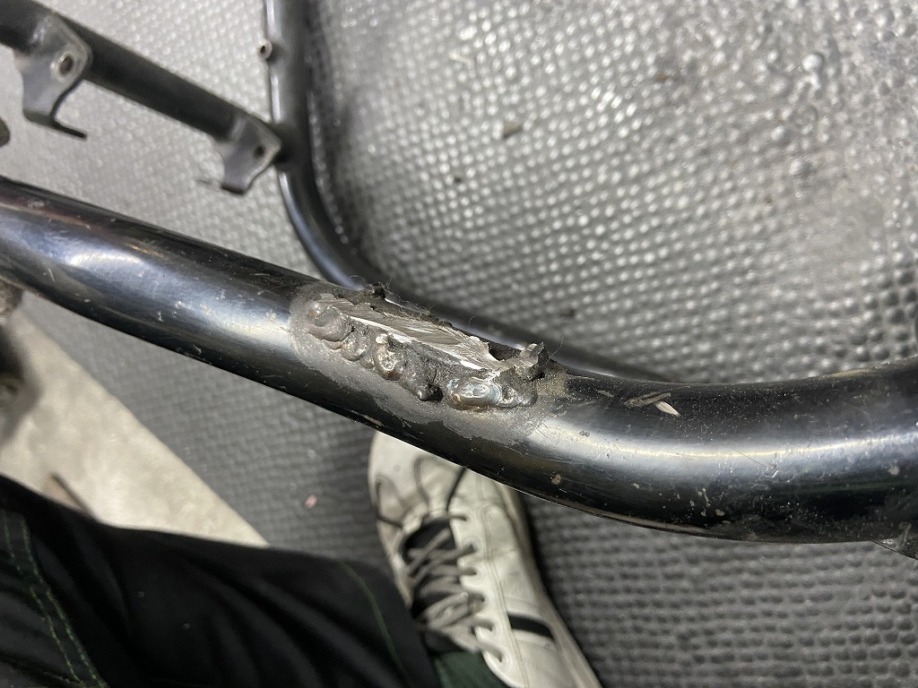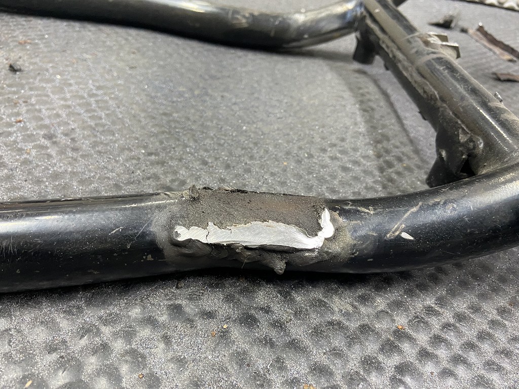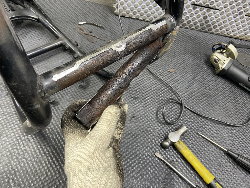 ブラケットを剥がした後のフレームはかなりさびていますね。フレーム内部もジャラジャラ音がするので、パイプ内もだいぶさびている模様。右下はサビで穴が開いていたところを修正した痕です。
