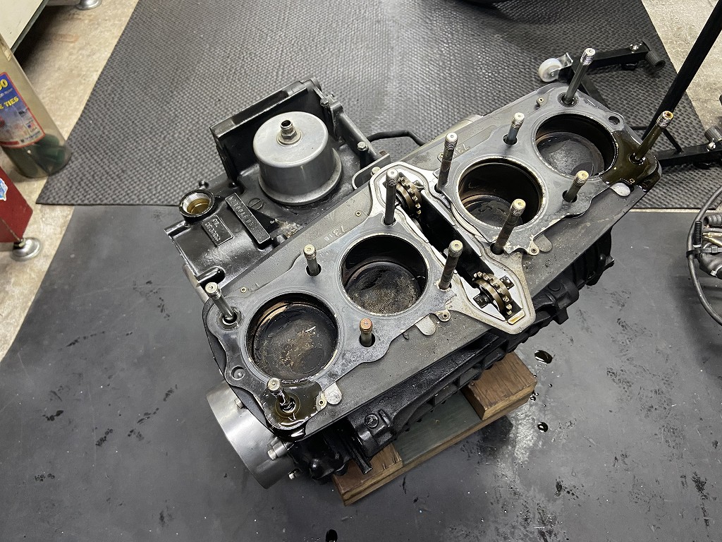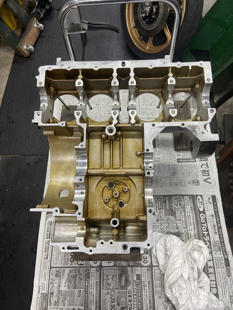 腰上が分解出来たらエンジンを反転させ、オイルパンを外します。