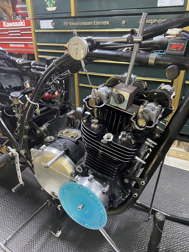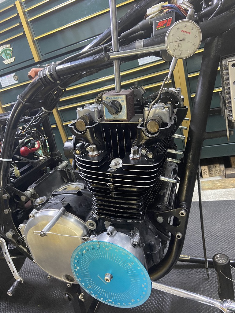 カムを取り付けバルブクリアランスを調整し、その後バルブタイミングを調整します。先ずは上死点を正確に割り出します。