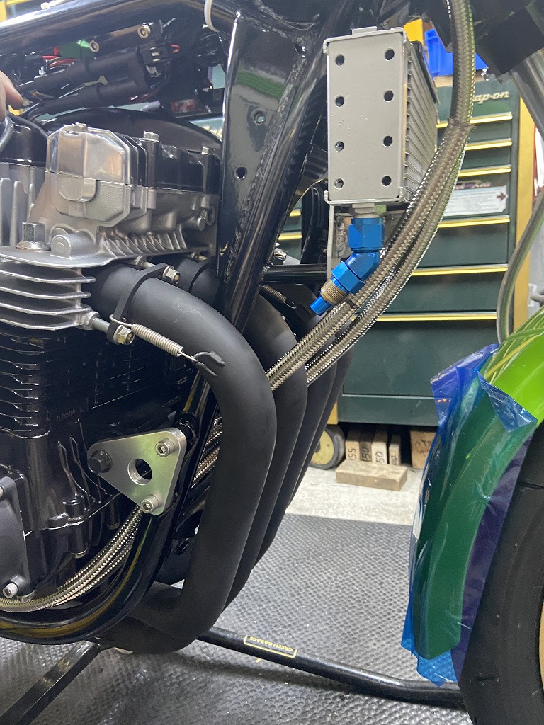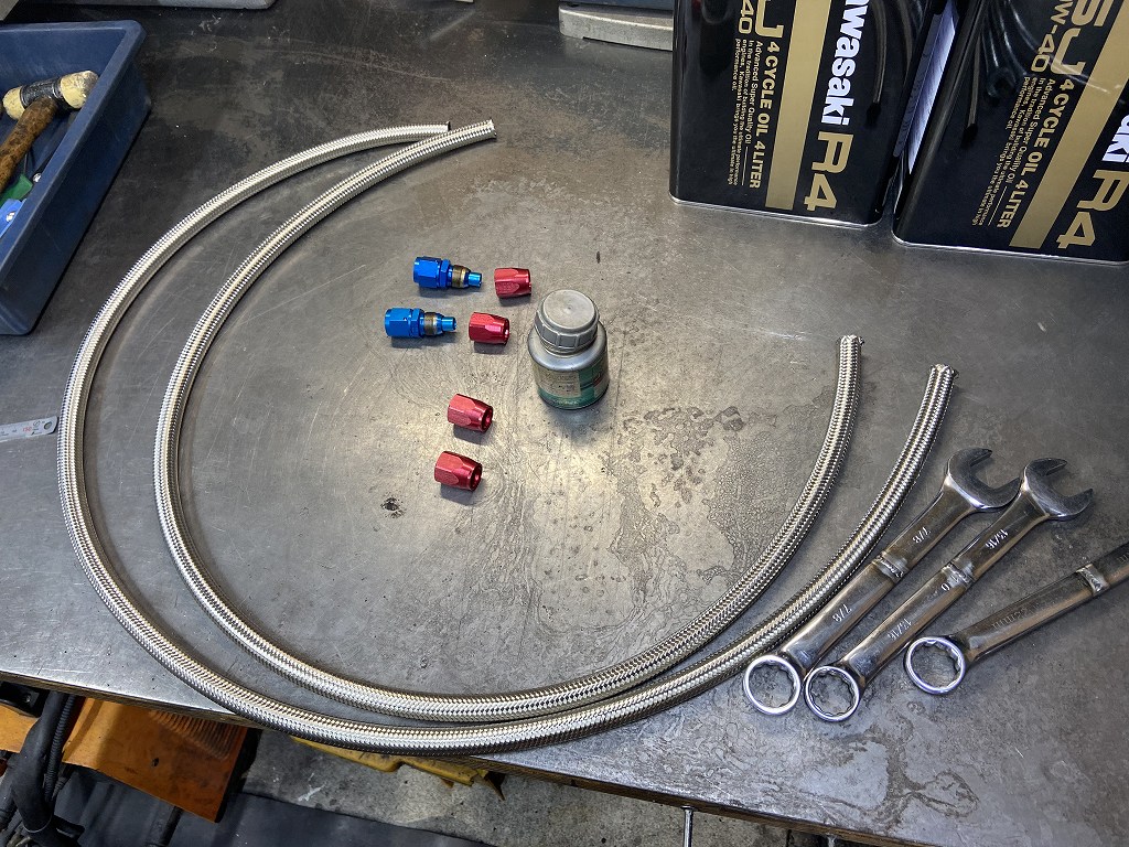 オイルクーラーホースを製作します。初めに少し長めに切断したホースを用意し、エンジン側のフィッティングだけ先に取り付けます。