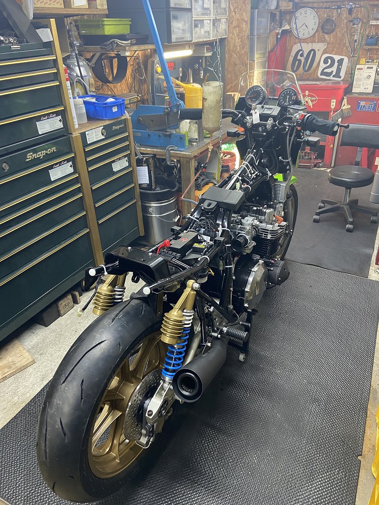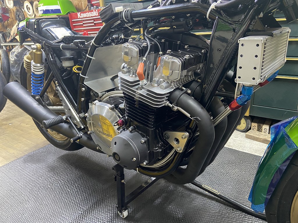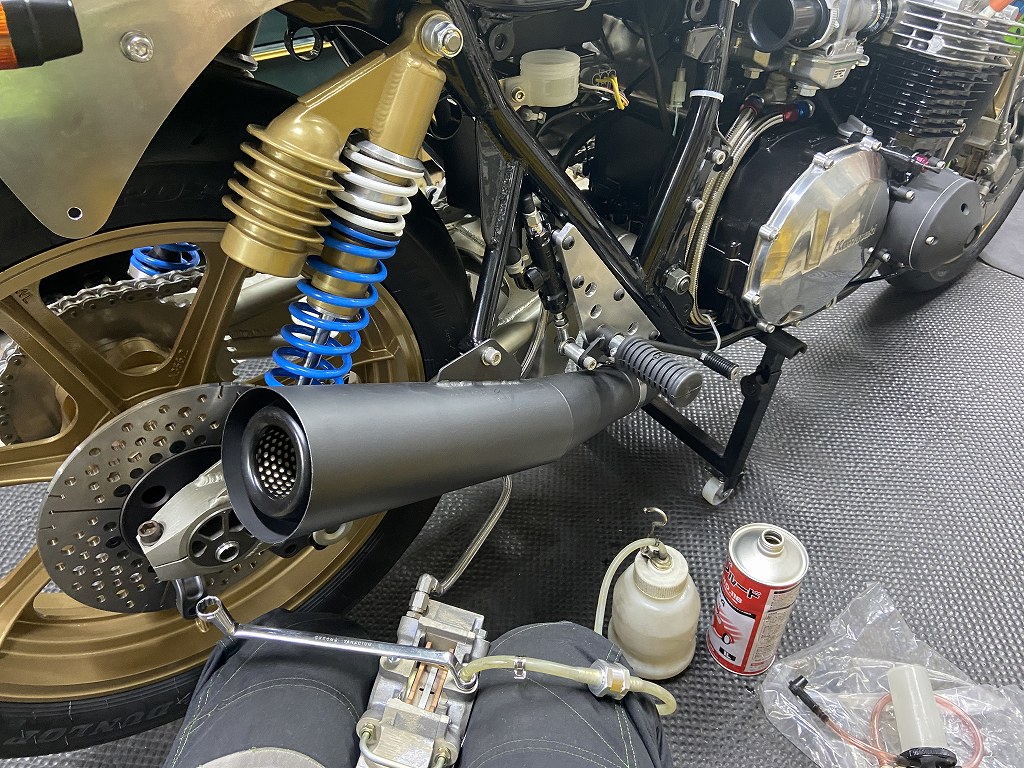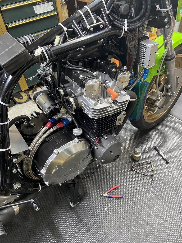 キャブを取り付け、ガソリンを供給し、エンジンオイルを入れてエンジンに初めて火を入れます。エンジンが静かに鼓動を始めると、生き返ったように1000Jが喜んでいるようです。