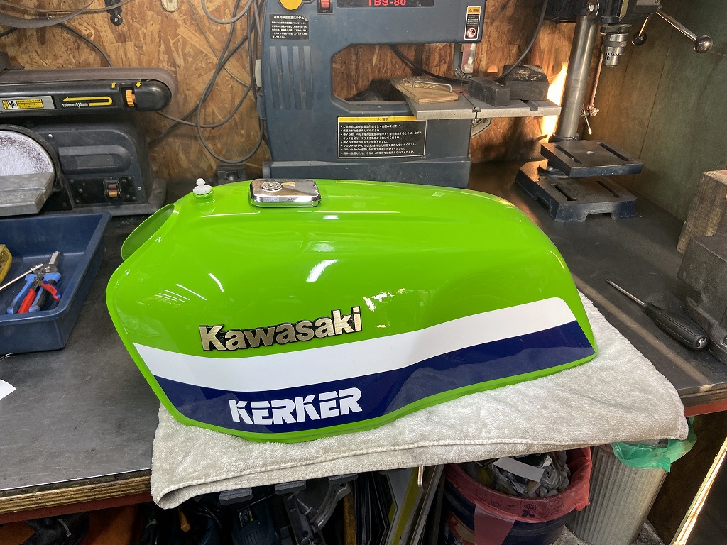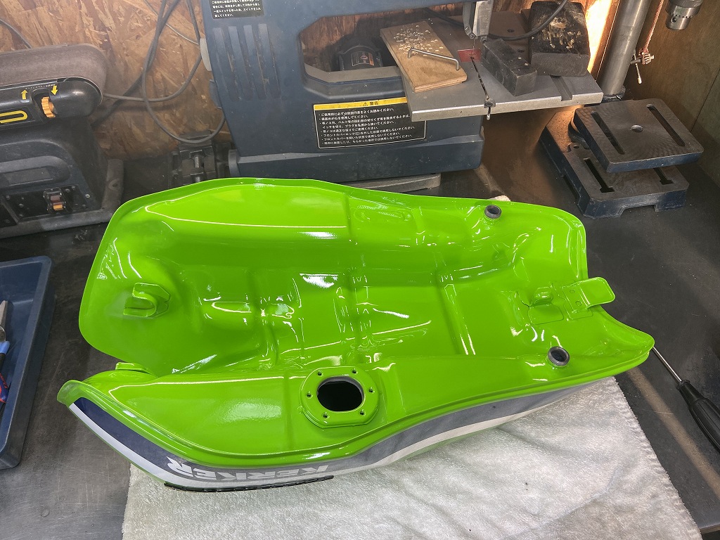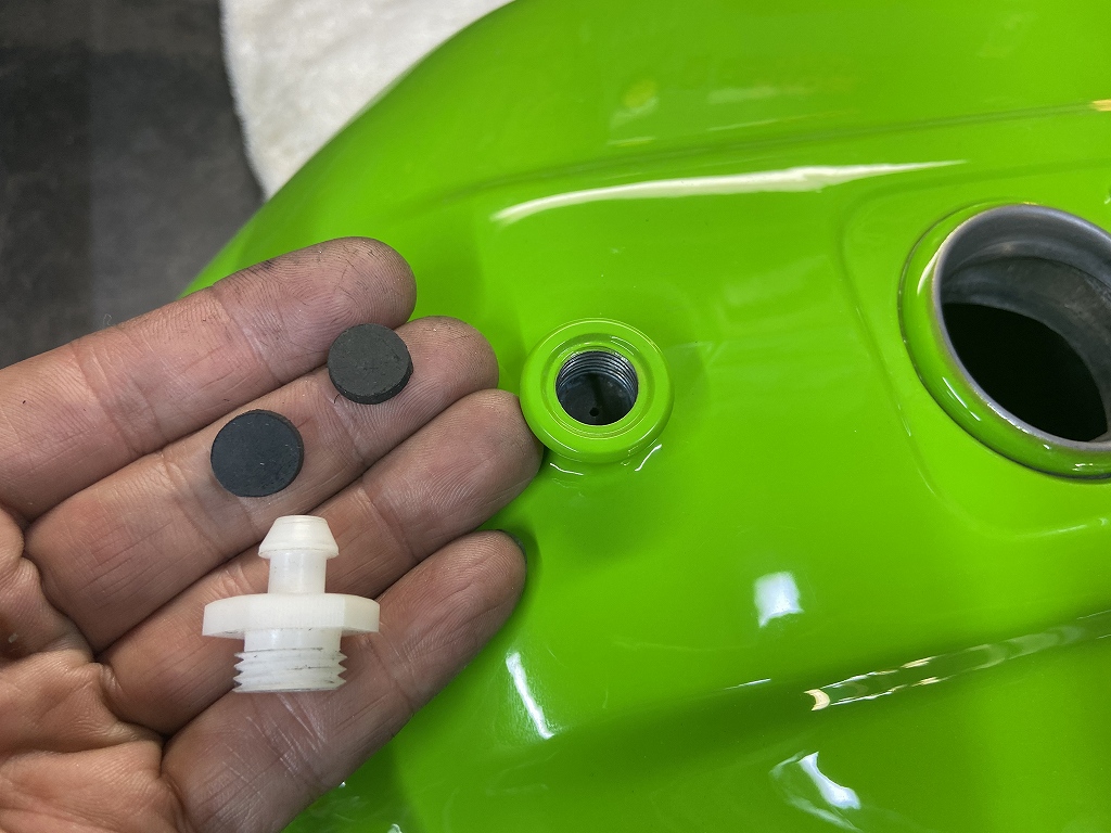 S1加工後、オーナーさんのところで塗装を終えたタンクです。ブリーザーはちゃんと機能しますが、通常はキャップにあるブリーザー機能で十分なので、このS1ブリーザーはゴム板を仕込んで塞いでダミー化しておきます。