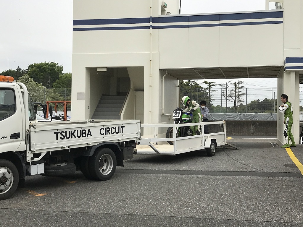 2回目走行でのトラブルは、最終コーナー立ち上がりでのエンジン失火。バンク中に点火が突然途切れて強大なエンブレがかかり、リヤは流れて大慌てでバイクを立て直し、そのままコース王しました。下の画像は3回目走行後の様子、この回もエンジンが失火して1ヘア出口でコースオフ。レッカーのお世話になりました。