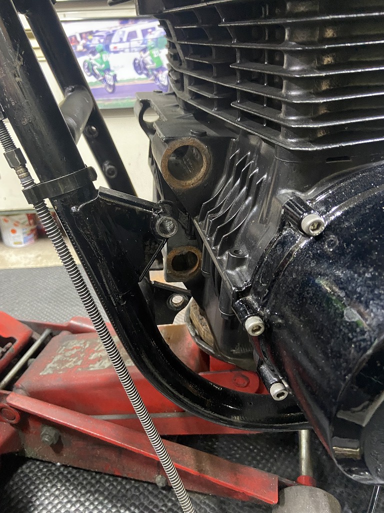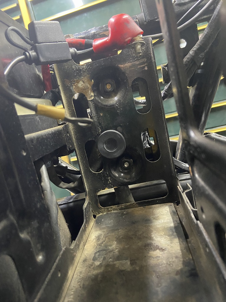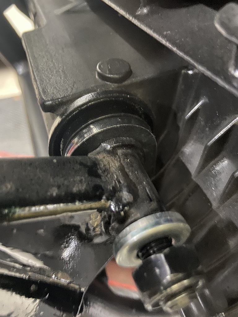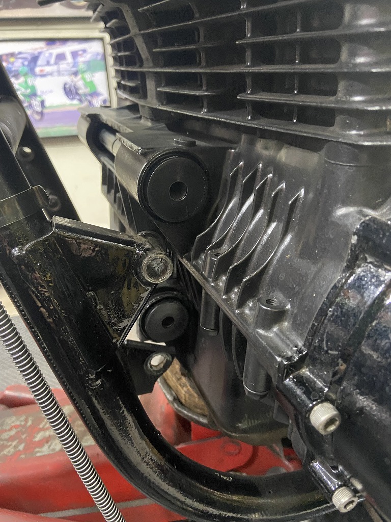 現状は、過去にインシュレーターの交換歴は無く、リヤのマウントボルトは少し曲がってきています。クランクケースにも少しダメージがあるので、早めの交換をお勧めしていました。