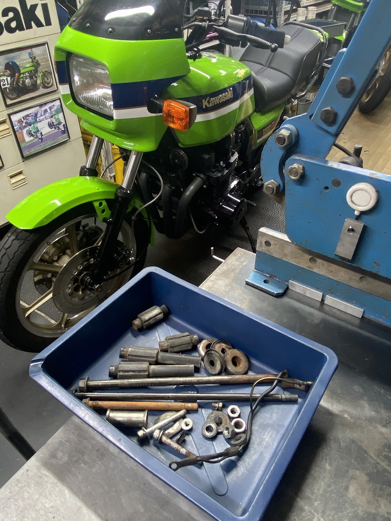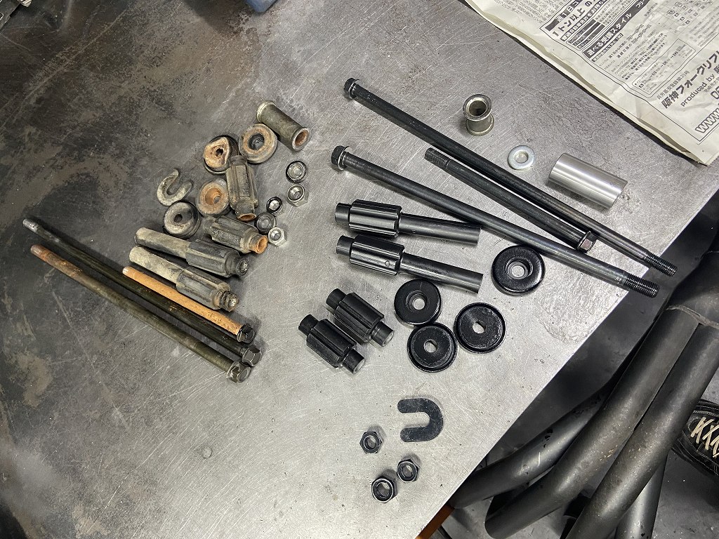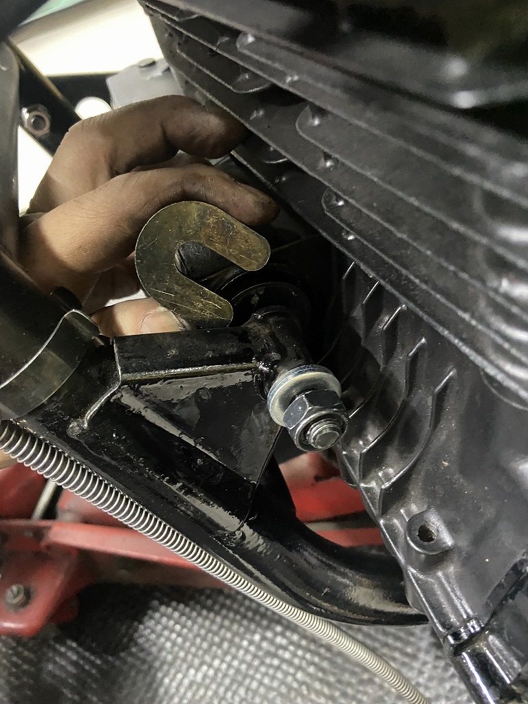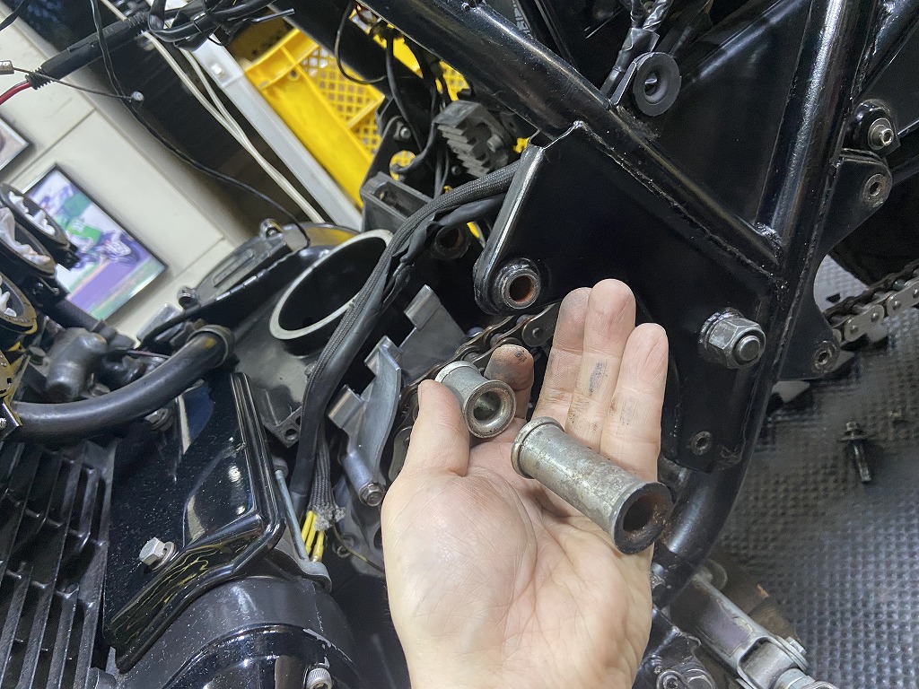 現状は、過去にインシュレーターの交換歴は無く、リヤのマウントボルトは少し曲がってきています。クランクケースにも少しダメージがあるので、早めの交換をお勧めしていました。