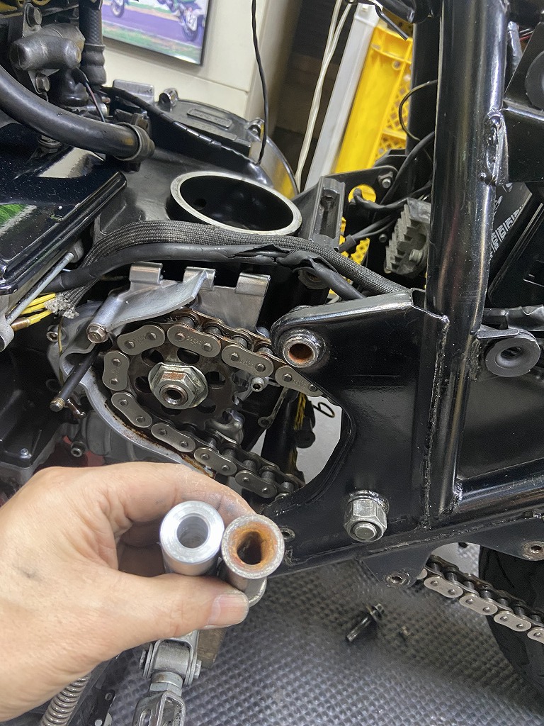 今回は接触面を増やすよう、ジュラルミンで作ったカラーに置き換えます。これはチェーン側だけで十分です。