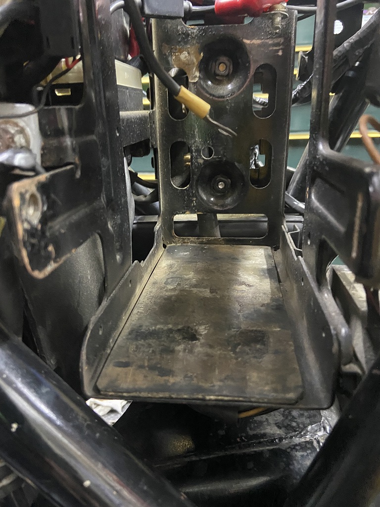 バッテリーがぐらつくので外して点検します。トレーも欠品していますが、奥のダンパーが付いていませんね。