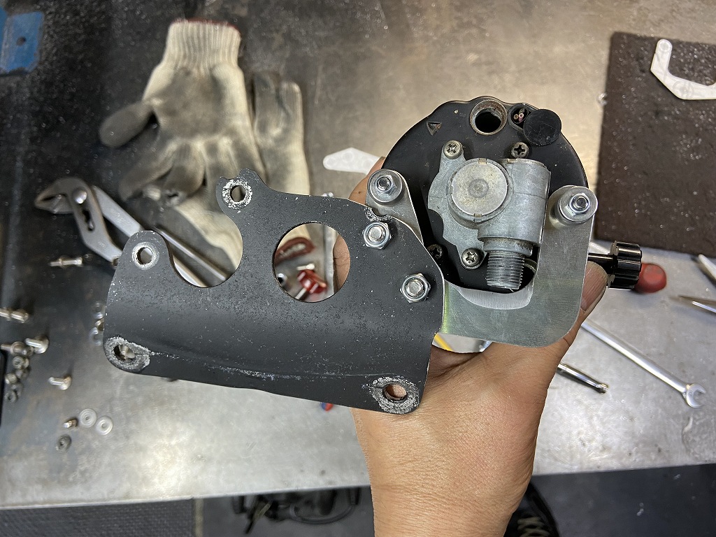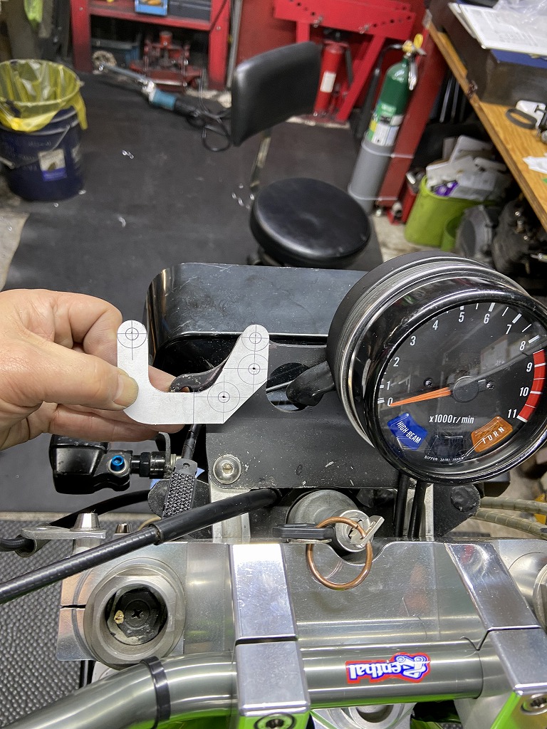 あれこれ検討し、ステーはこんな感じに設計しました。ベースのメーターブラケットも干渉するので若干加工します。