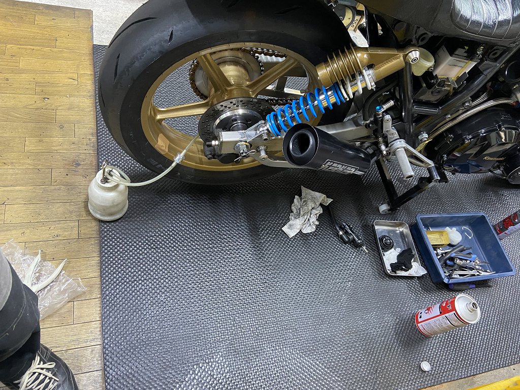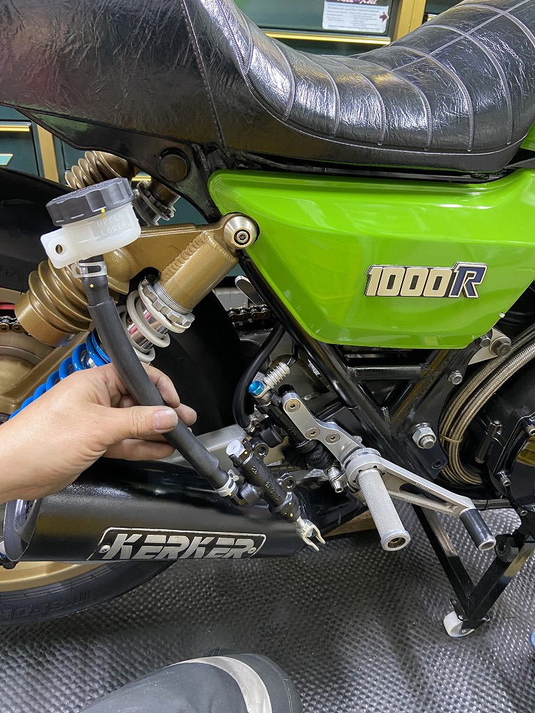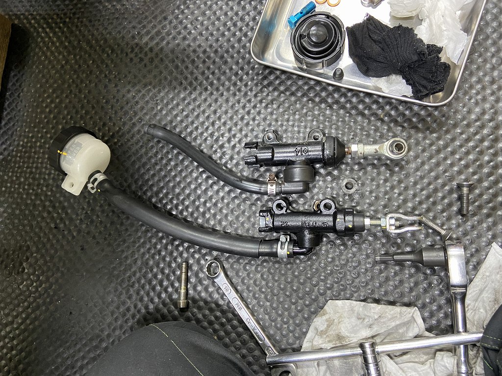 続いてリヤマスターを交換します。古いマスターが漏れてきたので、この機会に新品交換します。