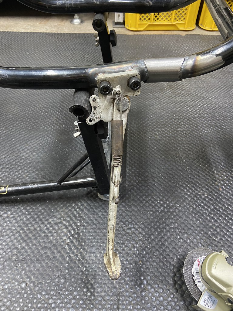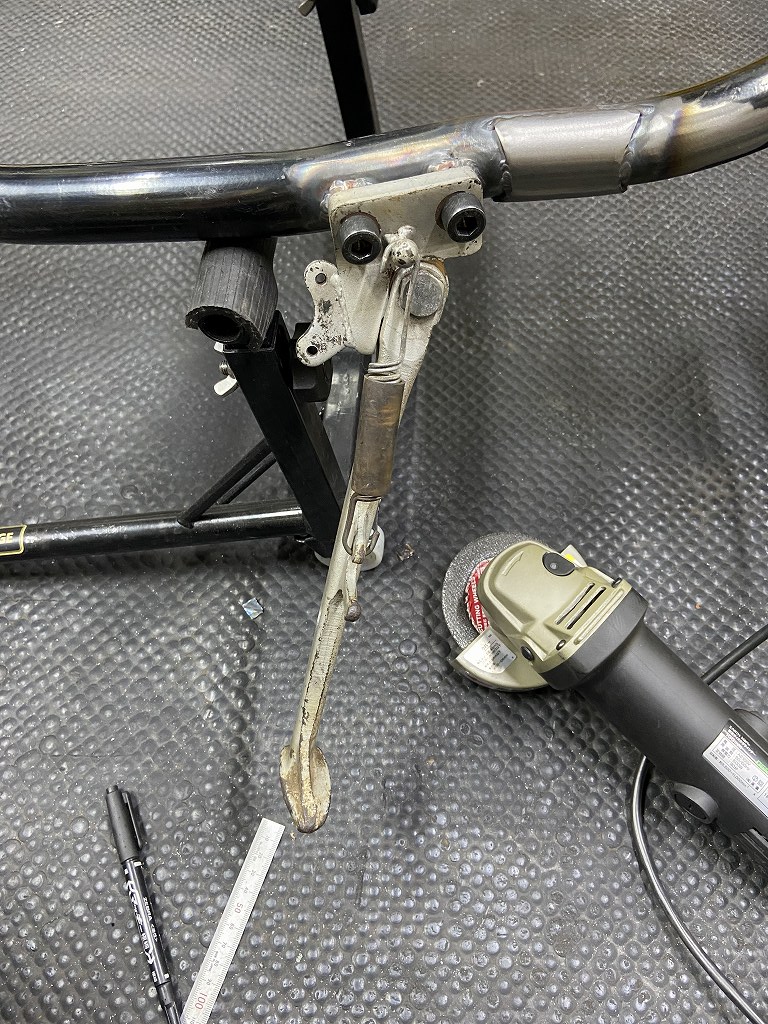 サイドスタンドは、前方への角度が浅いのでストッパー部分を削って修正します。