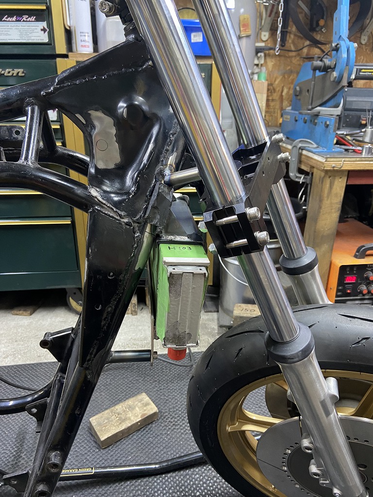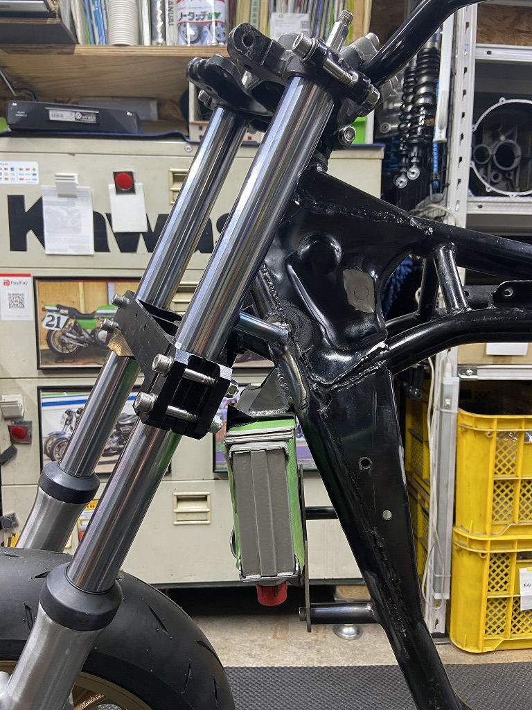 続いてハンドルストッパーを取り付けます。ストッパーはインナーチューブに突き当てる棒タイプで、これもS1と同じです。最大切れ角は、ステムとオイルクーラーコアのクリアランスで決まります。