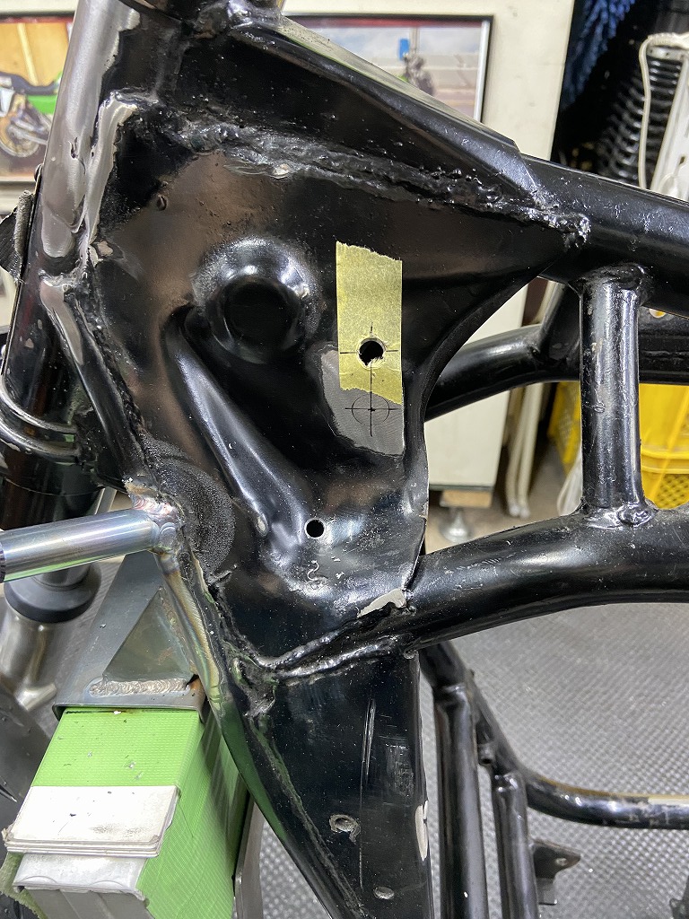 続いて、ワークス車同様にタンクを2センチ上にマウントします。フロントは元のピンを削除し、その上に穴を開けます。