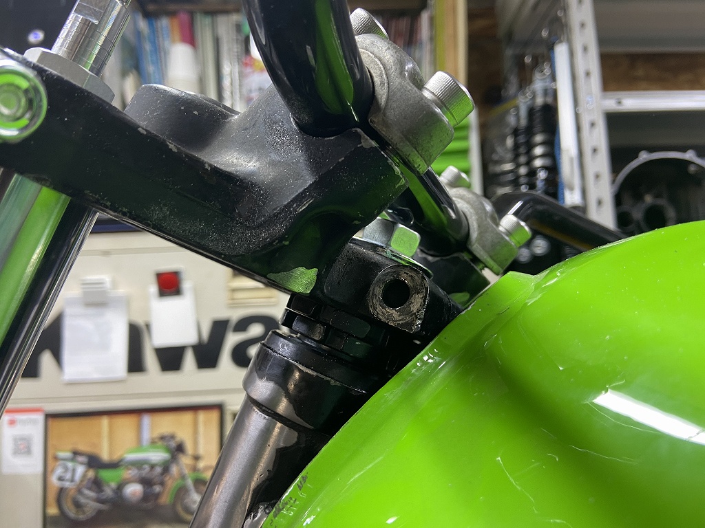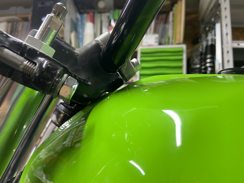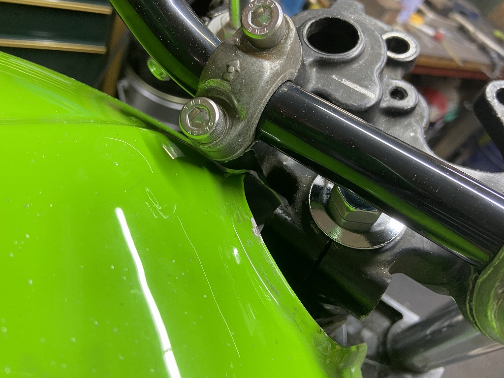 アッパーステムとタンクが干渉するのでステムを削って修正します。