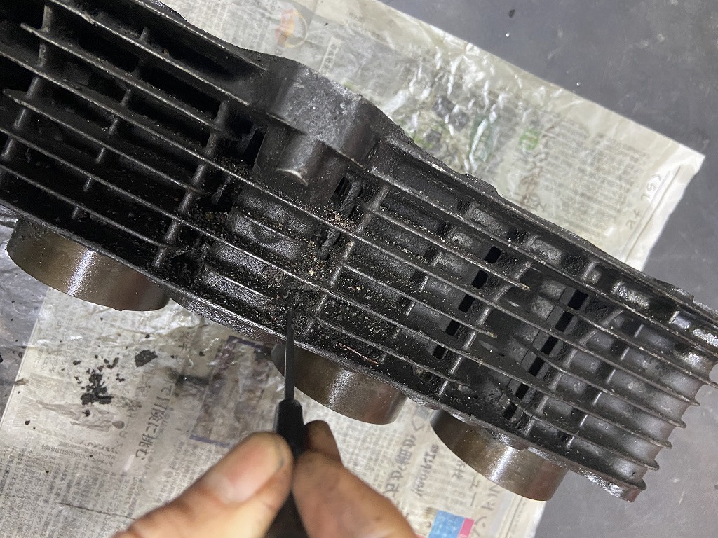 長年のオイル漏れにより、カムチェーントンネル周りは、泥や砂が付着してフィンの間や冷却風の通路が埋まっています。