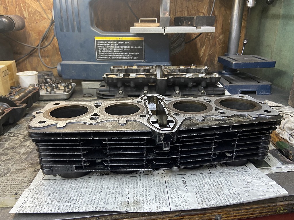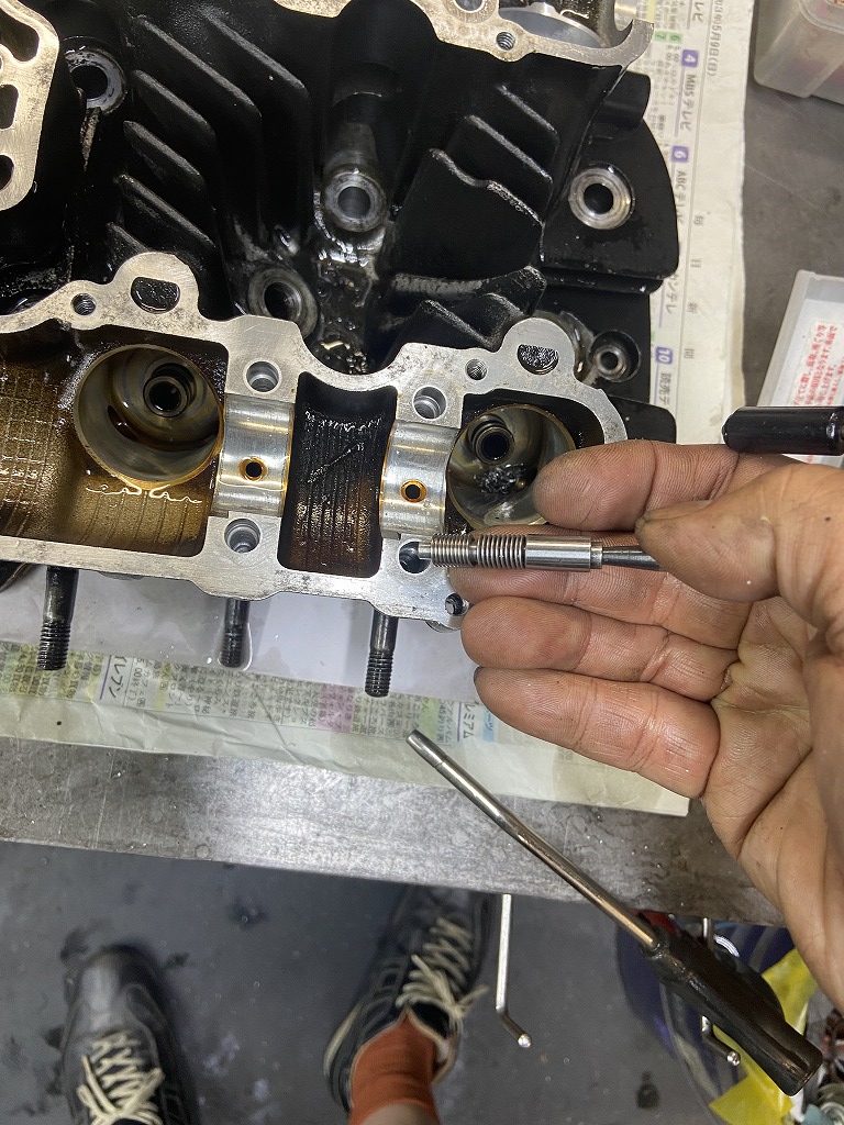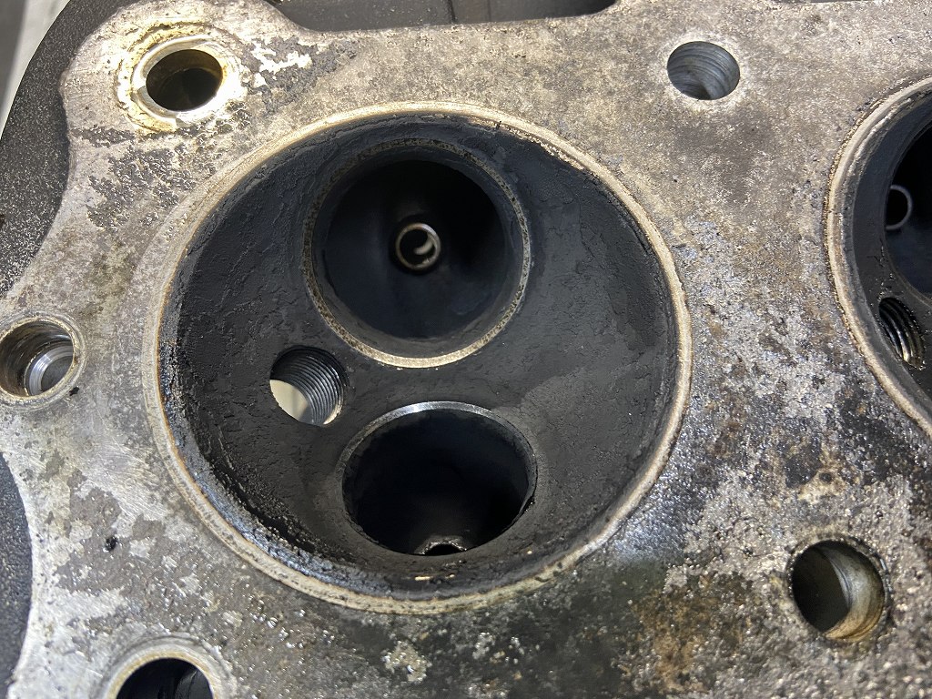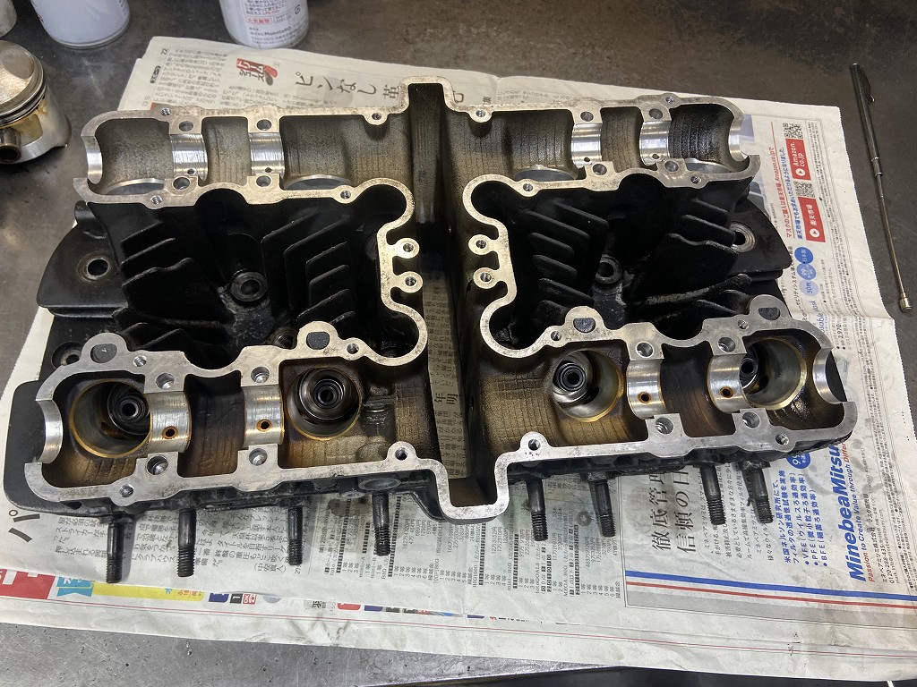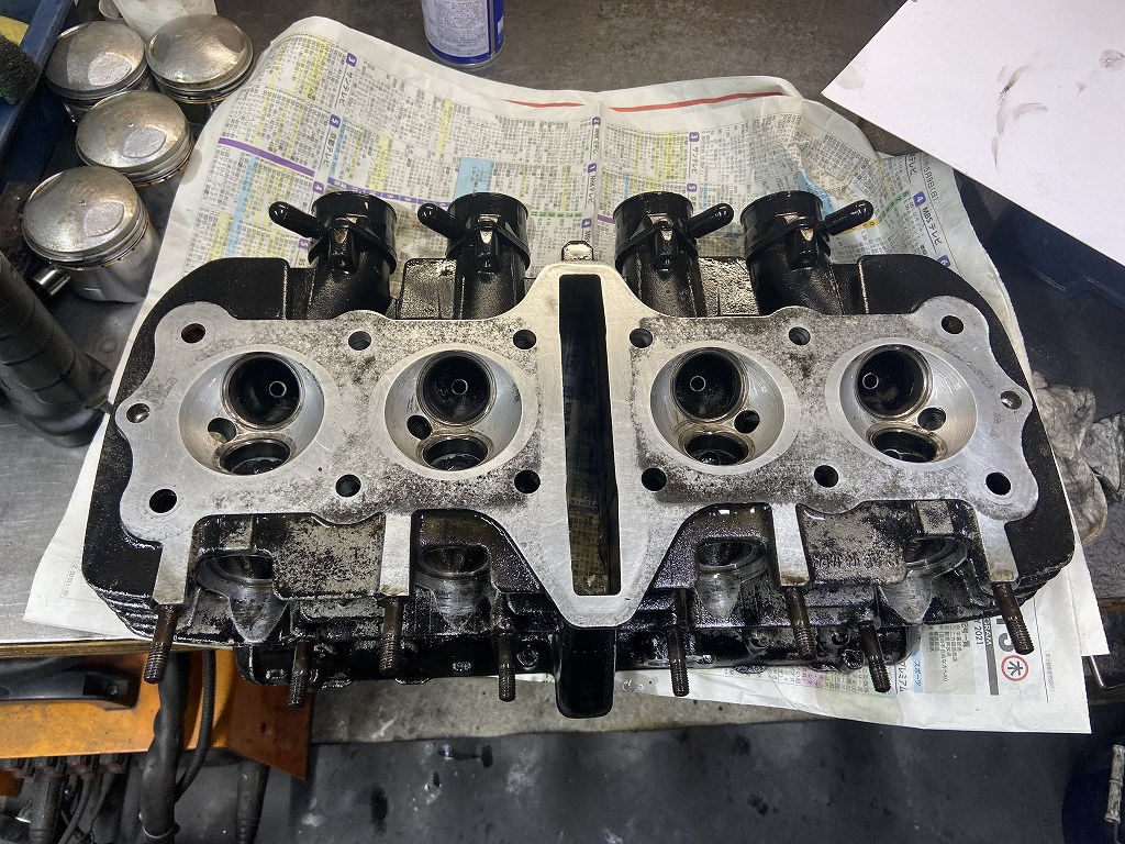 次に、ヘッドの分解点検と洗浄です。今回はコストを抑えてエンジン腰上のオイル漏れ修理が主な目的です。