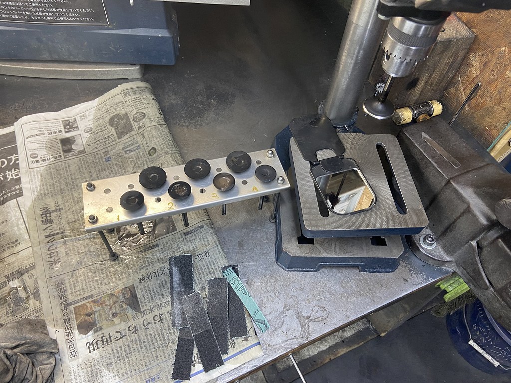 バルブは継続使用するので、ボール盤にくわえて回転させながらサンドペーパーでカーボンを落とします。