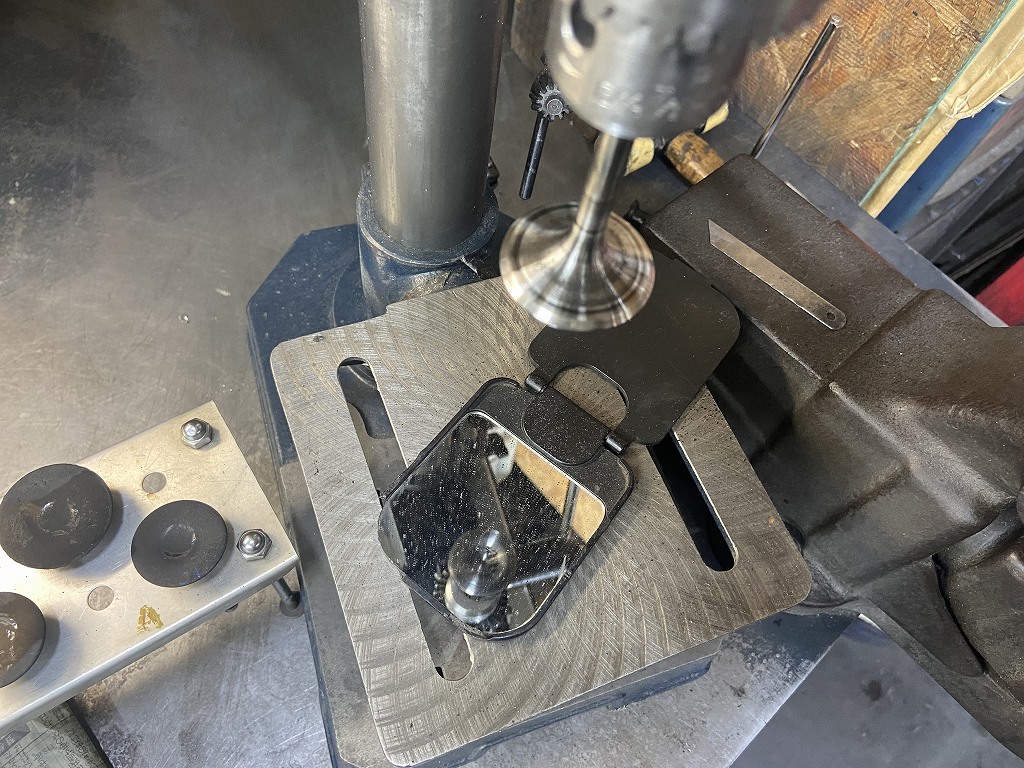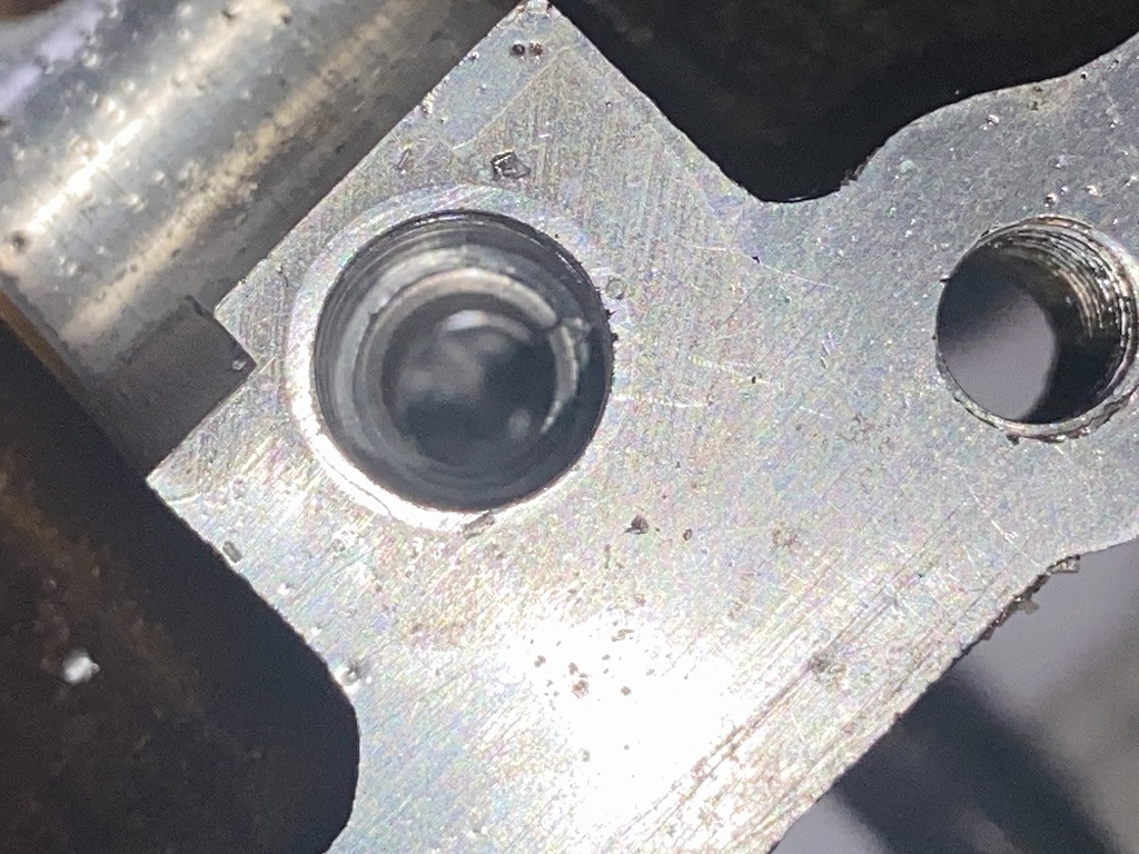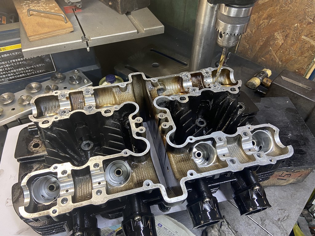 よく問題になるカムホルダーの雌ネジですが、インテーク側は問題ありませんでしたが、エキゾースト側2本がトルクが掛からない状態でした。念のためエキゾースト側8ヶ所全てヘリサート加工しておきます。先ずはドリルで下穴を開けます。